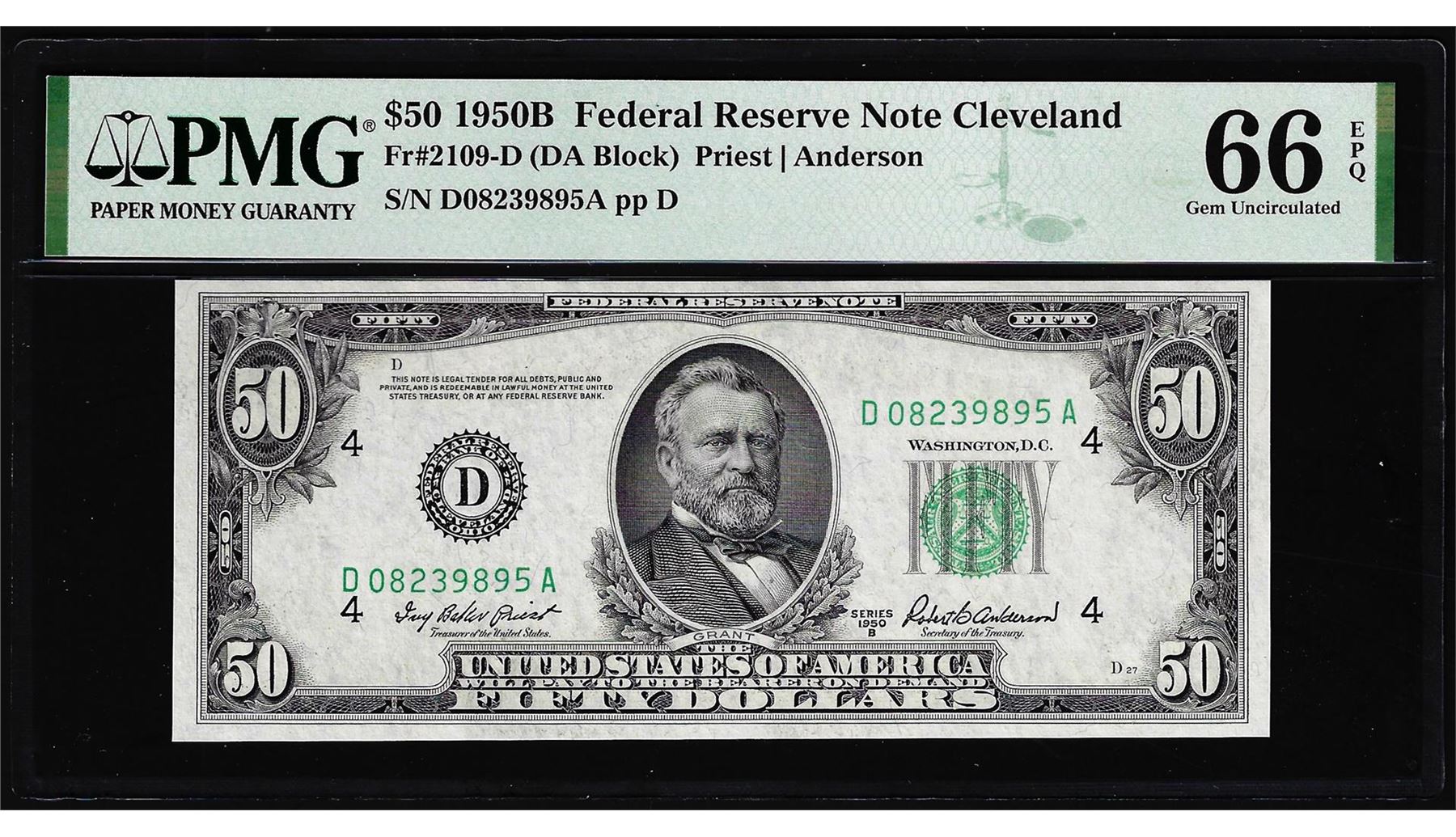 One 1950B $50 Federal Reserve Note Cleveland Fr.2109-D PMG Gem Uncirculated 66EPQ. PMG Certified.