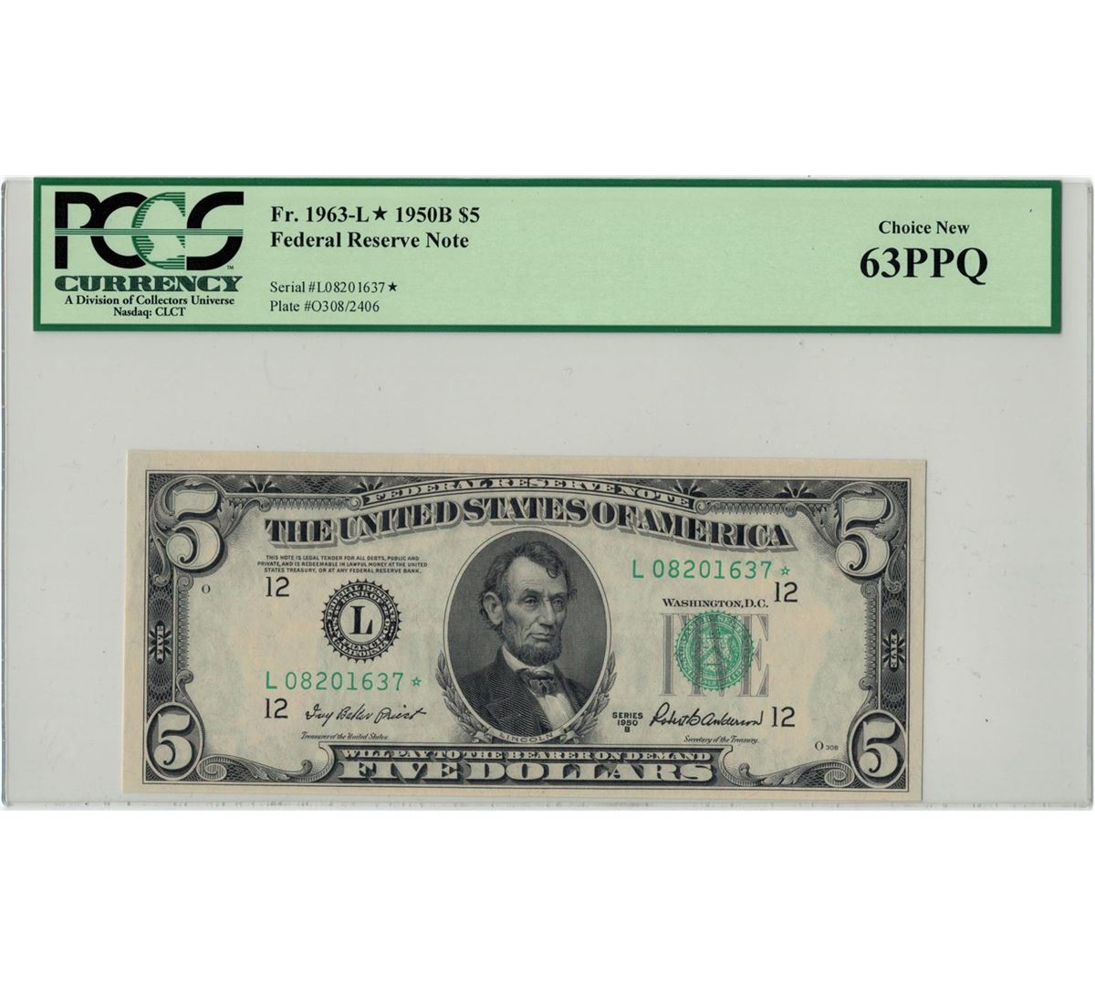 One 1950B PCGS CN 63PPQ $5 Federal Reserve Note. PCGS Certified.