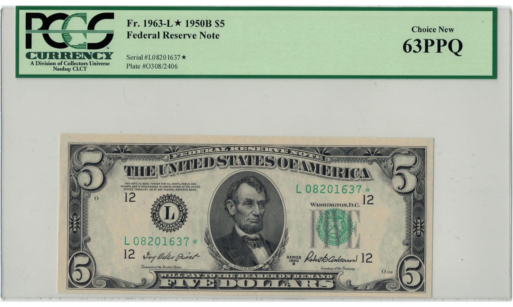 One 1950B PCGS CN 63PPQ $5 Federal Reserve Note. PCGS Certified.