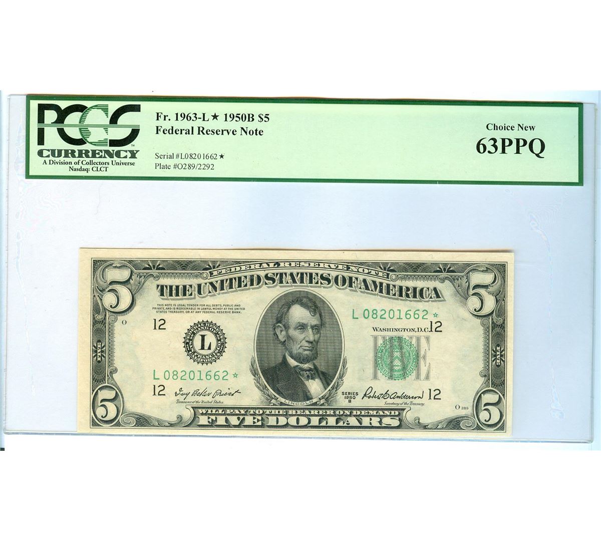 One 1950B PCGS CN 63PPQ $5 Federal Reserve Star Bank Note.