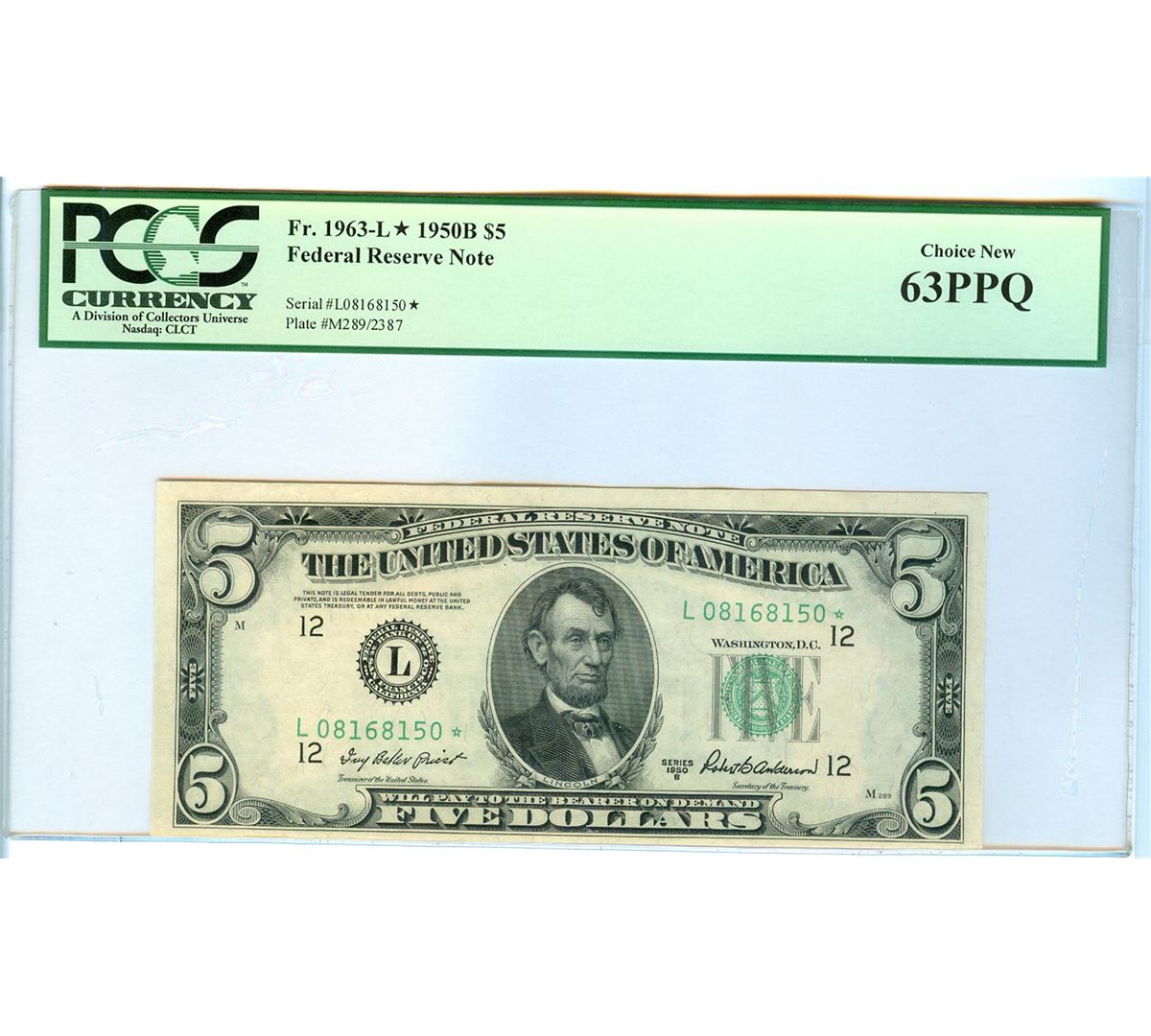 One 1950B PCGS CN 63PPQ $5 Federal Reserve Star Bank Note.