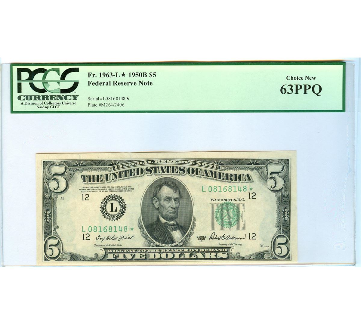 One 1950B PCGS CN 63PPQ $5 Federal Reserve Star Bank Note.