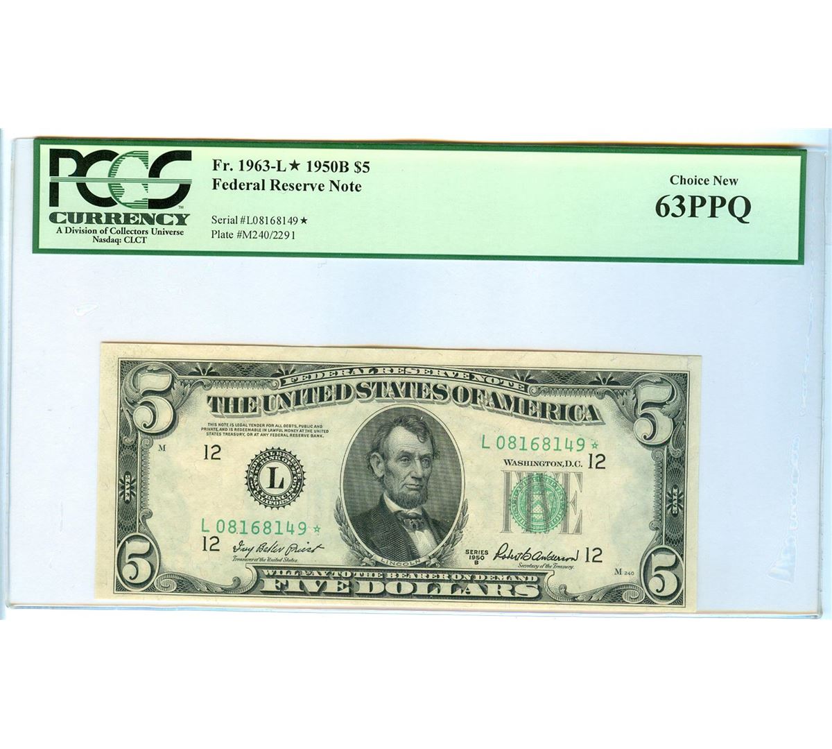 One 1950B PCGS CN 63PPQ $5 Federal Reserve Star Bank Note.