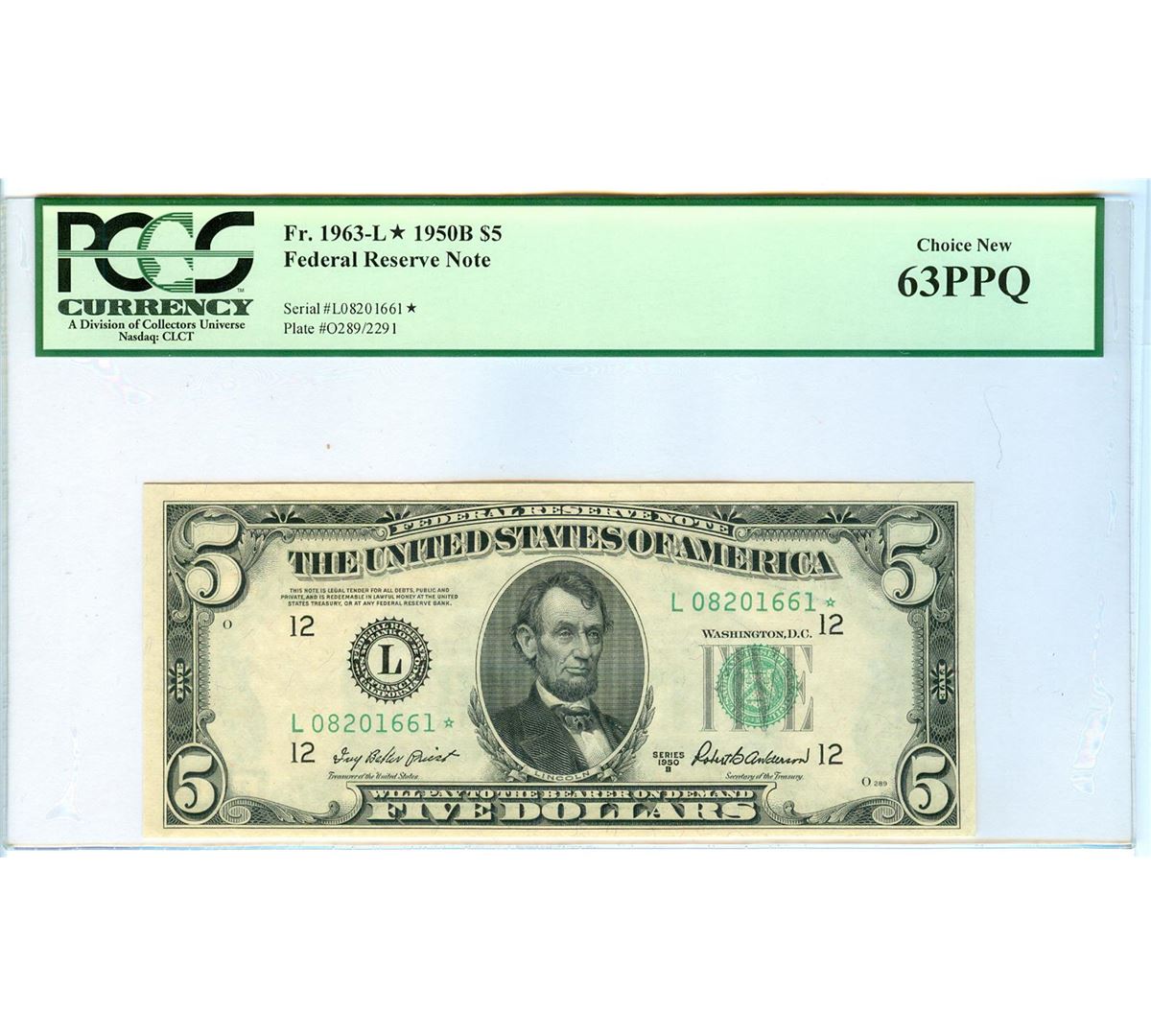 One 1950B PCGS CN 63PPQ $5 Federal Reserve Star Bank Note.