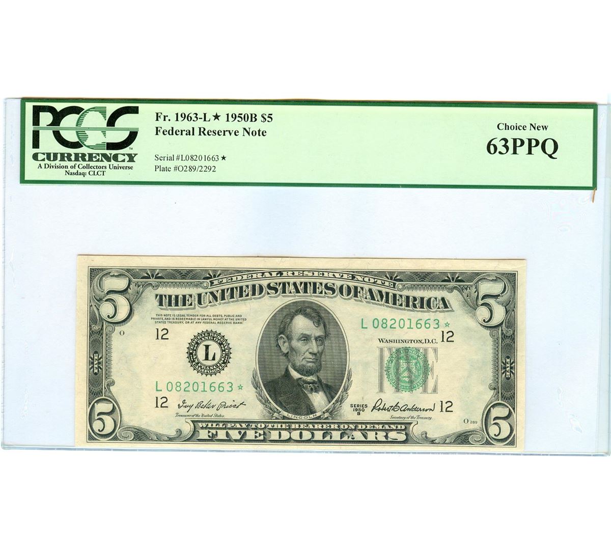One 1950B PCGS CN 63PPQ $5 Federal Reserve Star Bank Note.