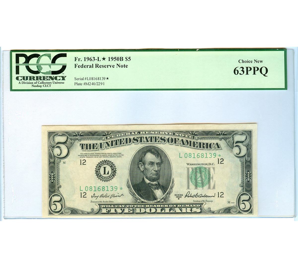 One 1950B PCGS CN 63PPQ $5 Federal Reserve Star Bank Note.