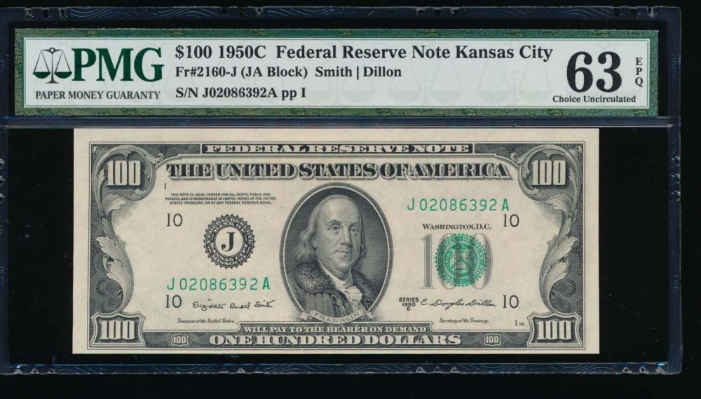 One 1950C $100 Kansas City Federal Reserve Note PMG 63EPQ.