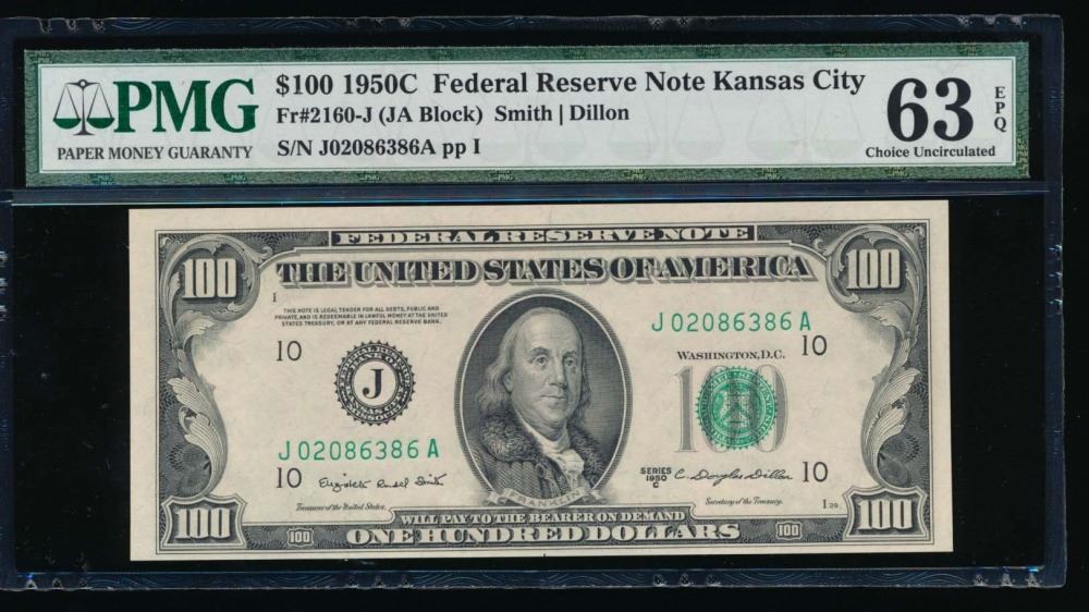 One 1950C $100 Kansas City Federal Reserve Note PMG 63EPQ.