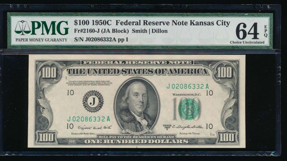 One 1950C $100 Kansas City Federal Reserve Note PMG 64EPQ.