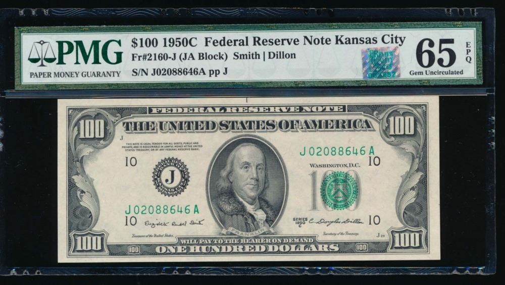 One 1950C $100 Kansas City Federal Reserve Note PMG 65EPQ.