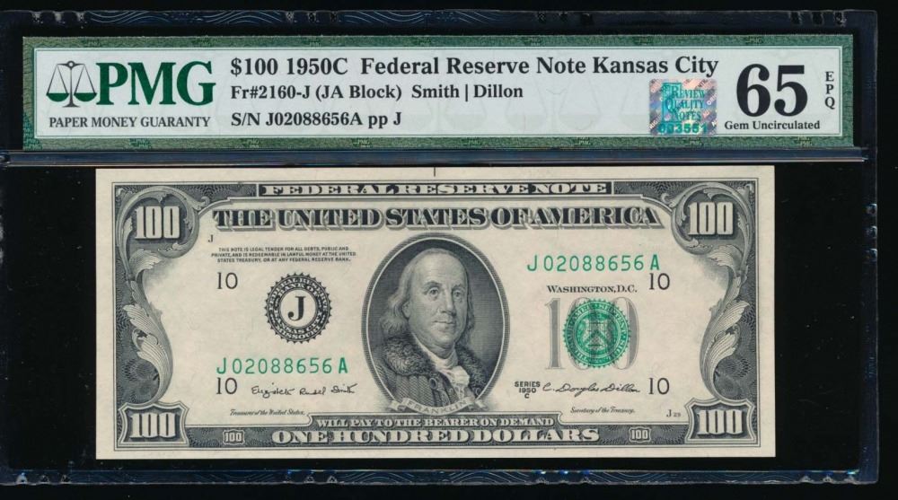 One 1950C $100 Kansas City Federal Reserve Note PMG 65EPQ.