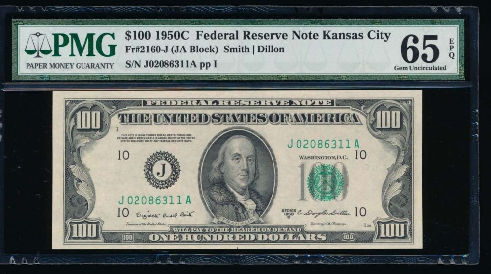One 1950C $100 Kansas City Federal Reserve Note PMG 65EPQ.