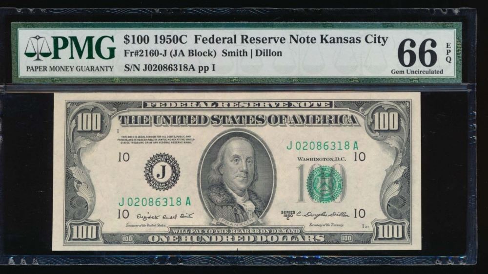 One 1950C $100 Kansas City Federal Reserve Note PMG 66EPQ.