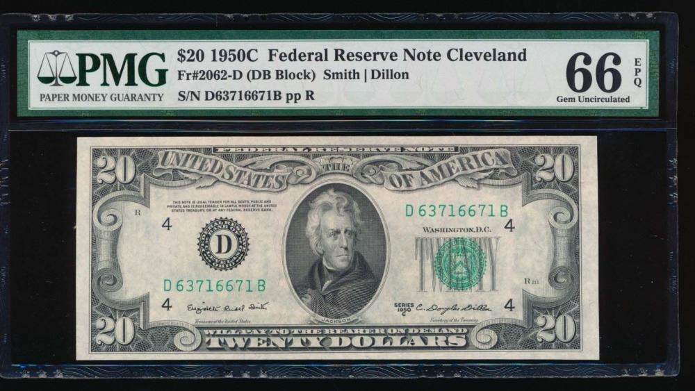 One 1950C $20 Cleveland Federal Reserve Note PMG 66EPQ.