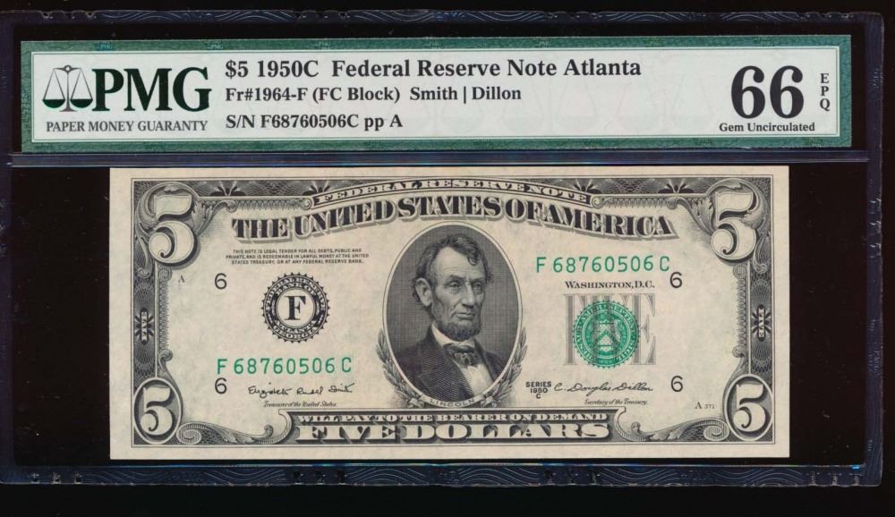 One 1950C $5 Atlanta Federal Reserve Note PMG 66EPQ.