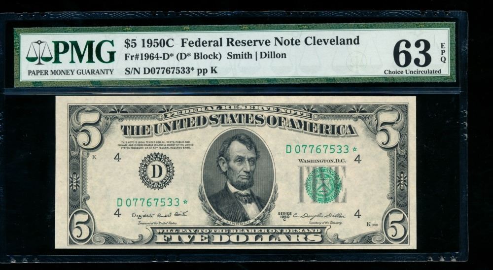 One 1950C $5 STAR Cleveland FRN PMG 63EPQ.