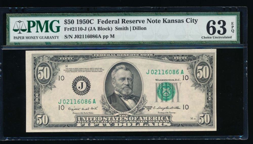 One 1950C $50 Kansas City Federal Reserve Note PMG 63EPQ.