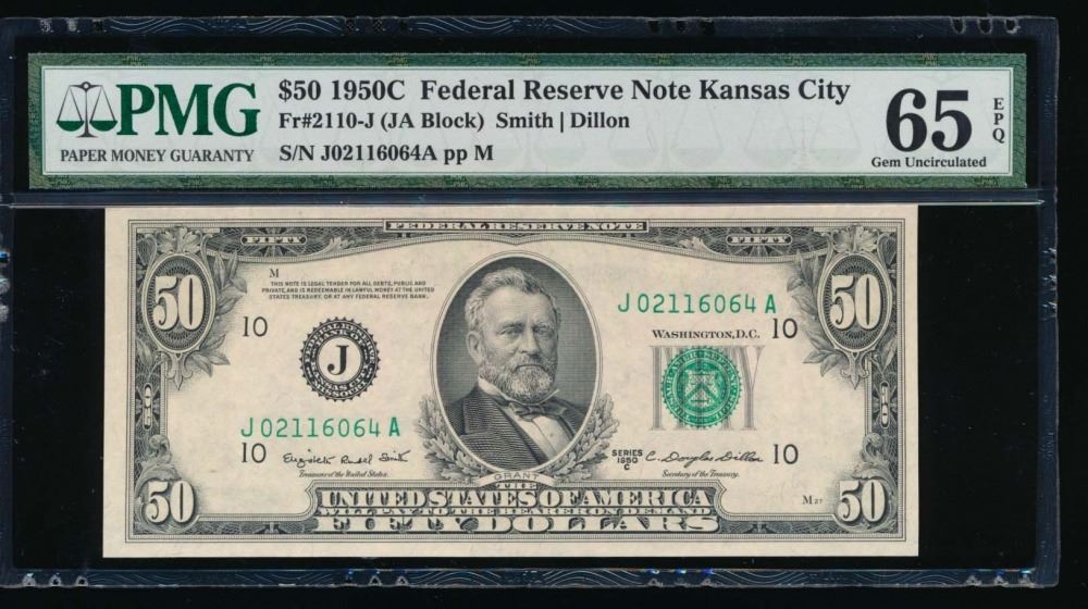 One 1950C $50 Kansas City Federal Reserve Note PMG 65EPQ.