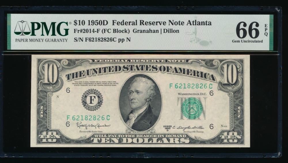 One 1950D $10 Atlanta FRN PMG 66EPQ.