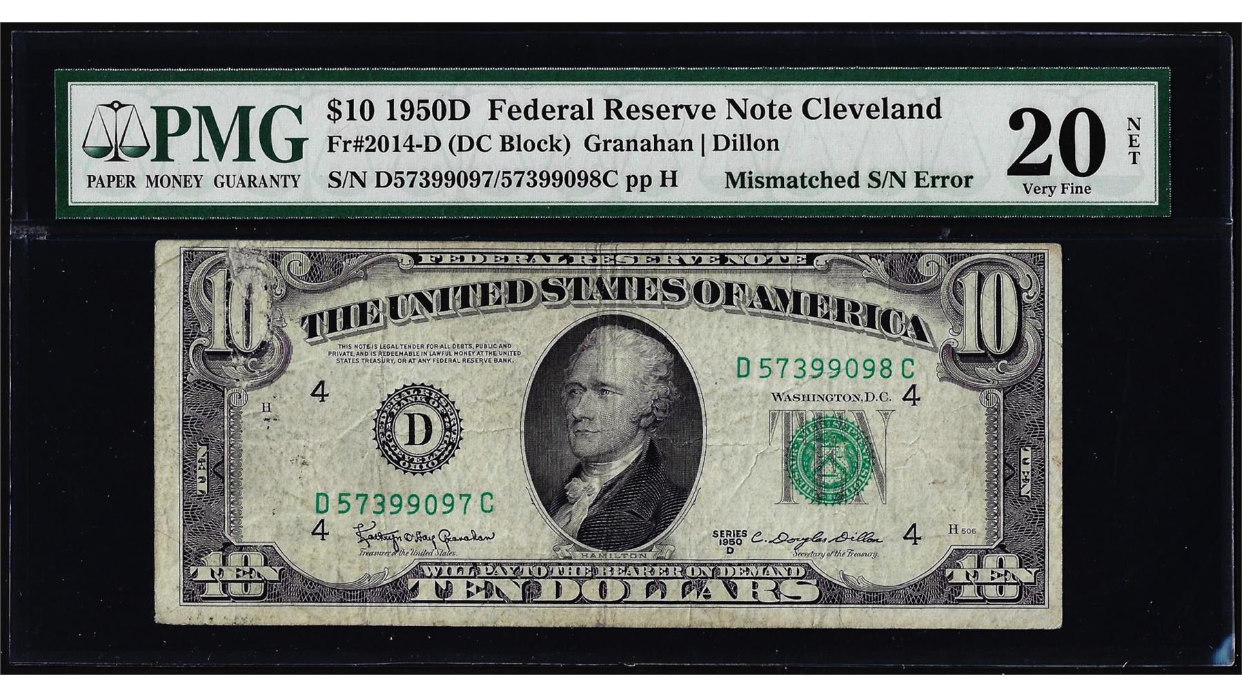One 1950D $10 Federal Reserve Note Mismatched Serial Number Error PMG Very Fine 20 Net. PMG Certified.