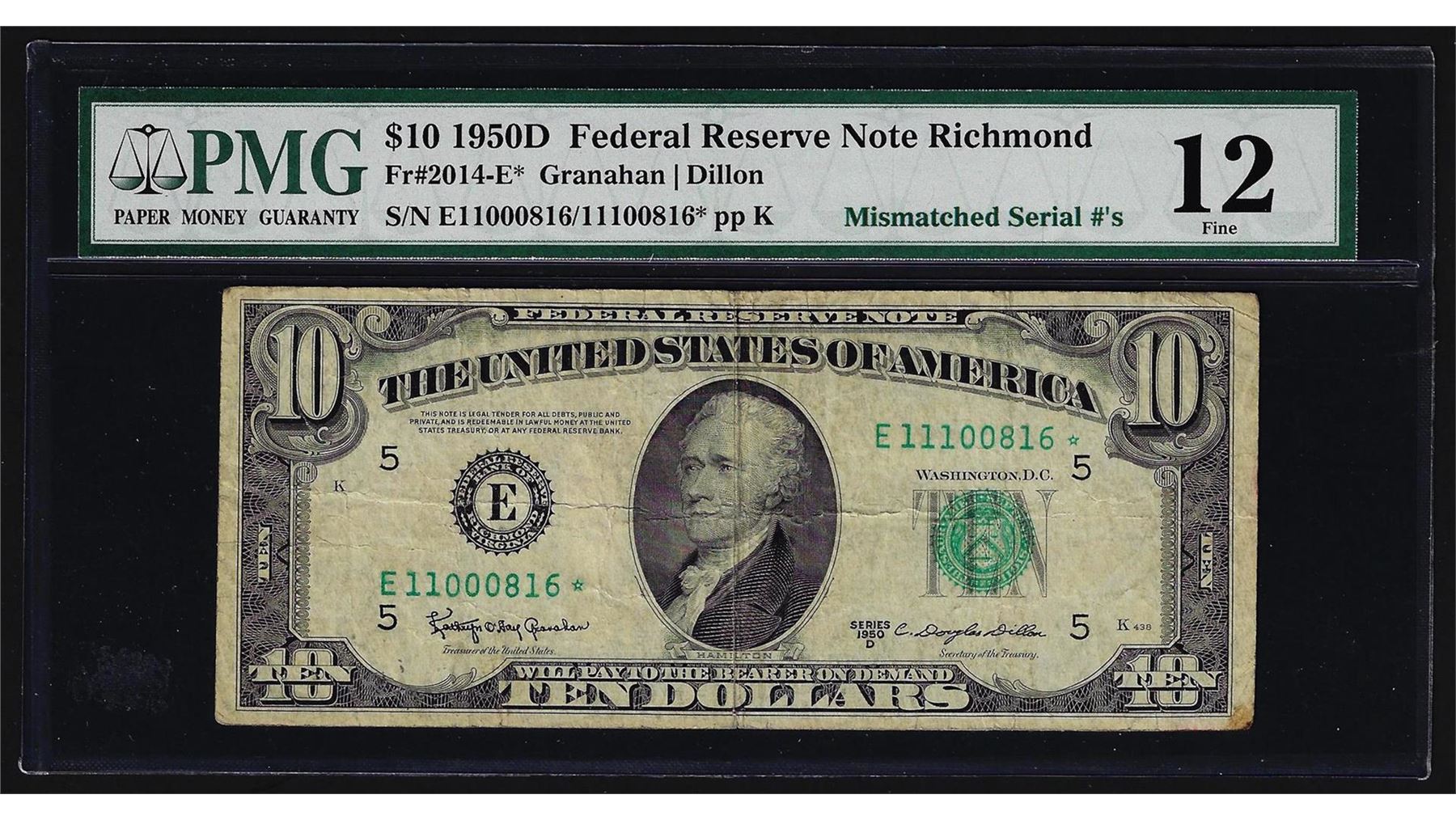 One 1950D $10 Federal Reserve STAR Note Mismatched Serial Number ERROR PMG F12. PMG Certified.