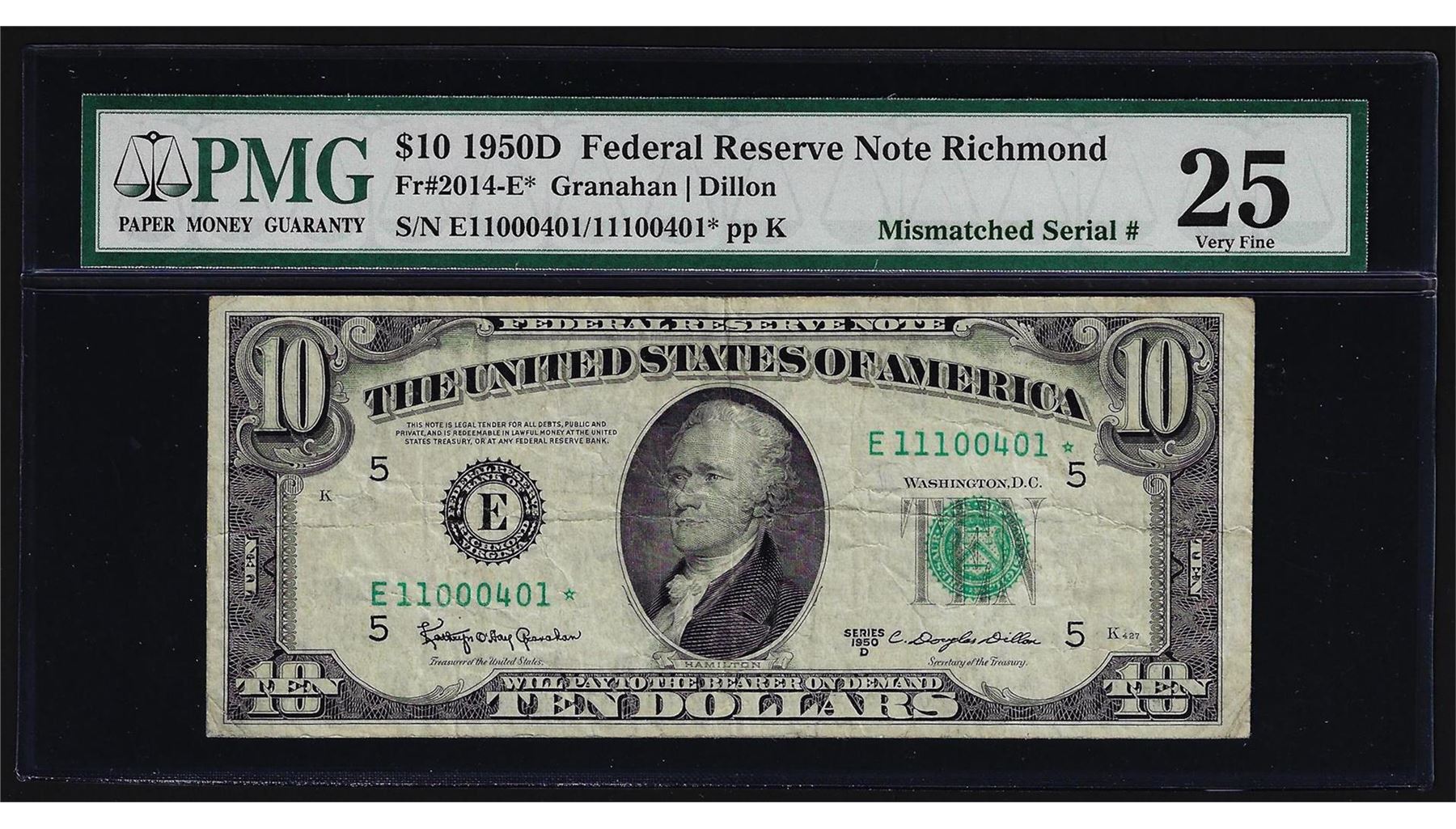 One 1950D $10 Federal Reserve STAR Note Mismatched Serial Number ERROR PMG VF25. PMG Certified.