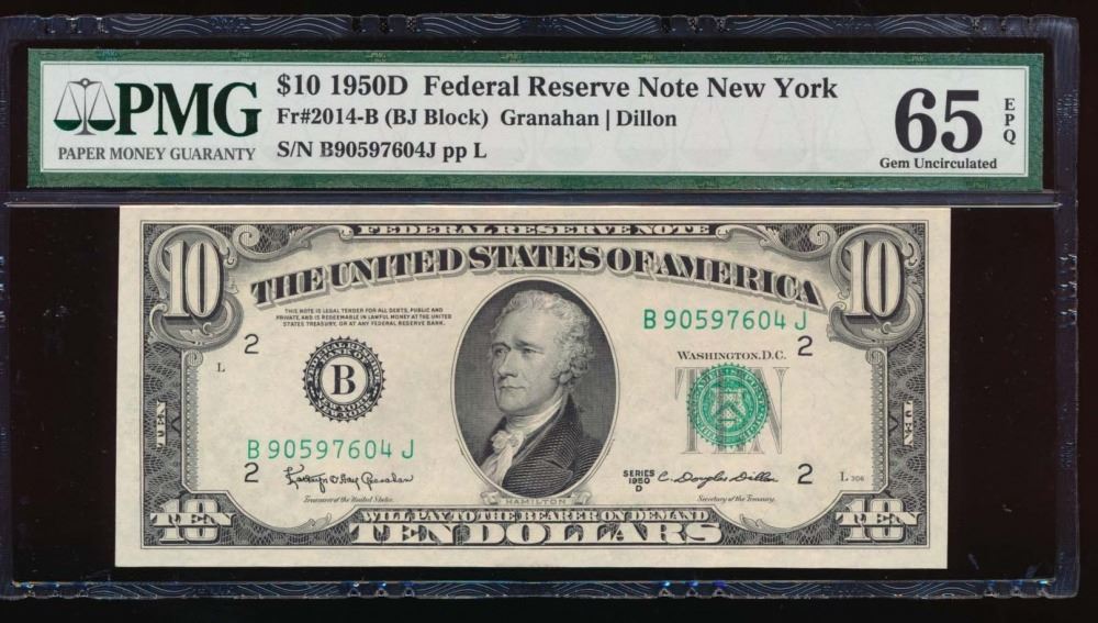 One 1950D $10 New York Federal Reserve Note PMG 65EPQ.