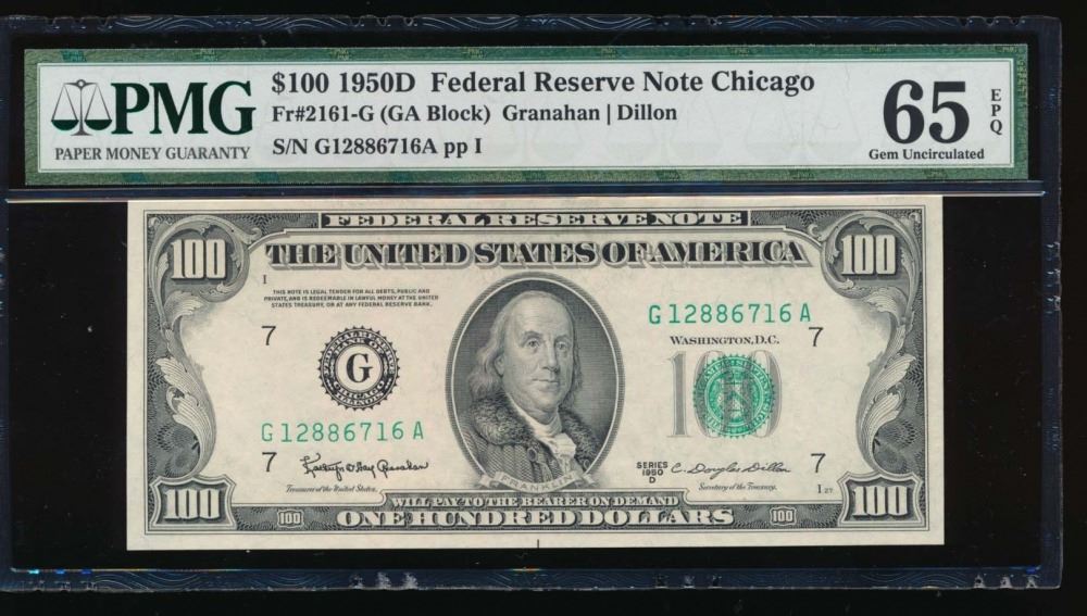 One 1950D $100 Chicago Federal Reserve Note PMG 65EPQ.