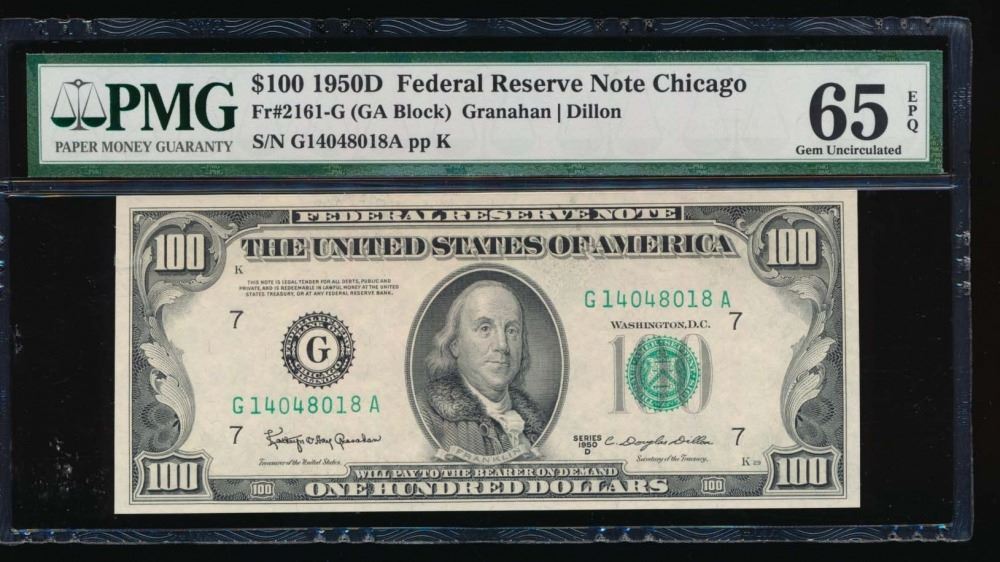 One 1950D $100 Chicago Federal Reserve Note PMG 65EPQ.
