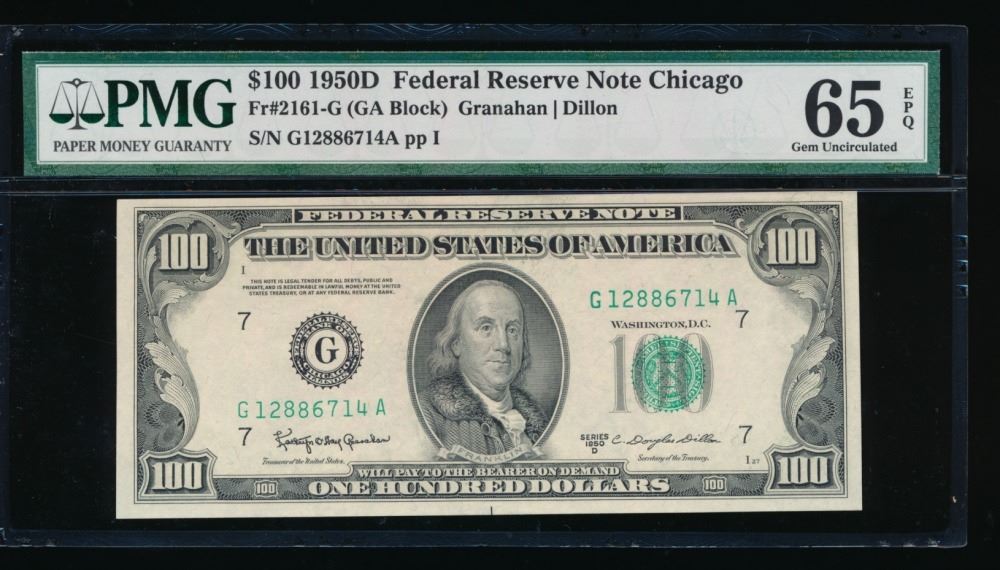 One 1950D $100 Chicago Federal Reserve Note PMG 65EPQ.