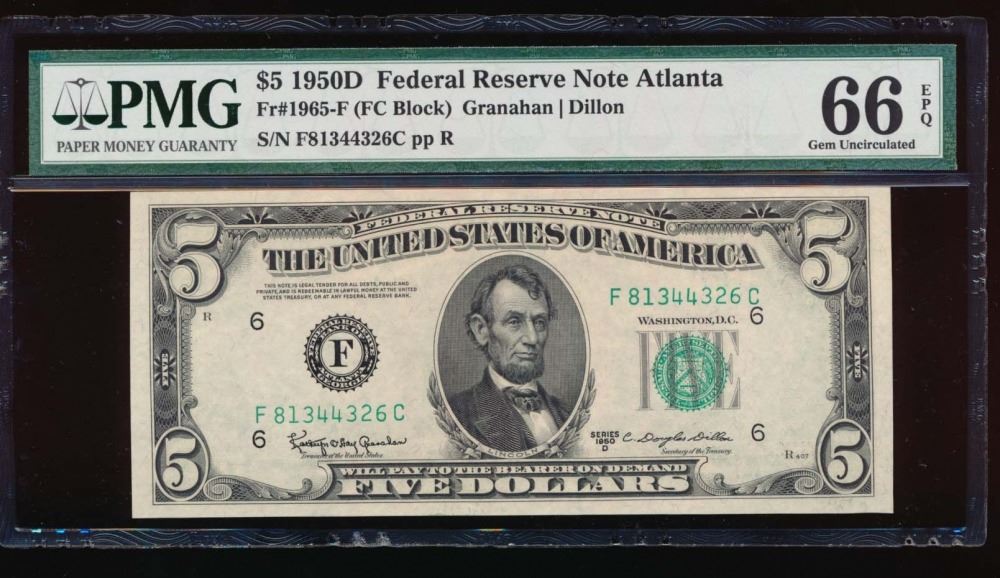 One 1950D $5 Atlanta Federal Reserve Note PMG 66EPQ.