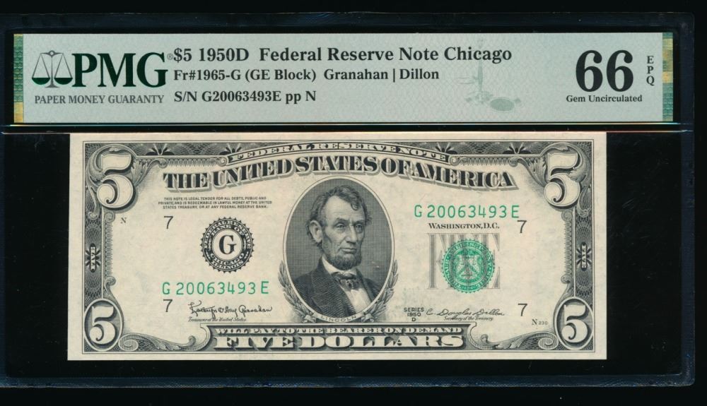 One 1950D $5 Chicago FRN PMG 66EPQ.
