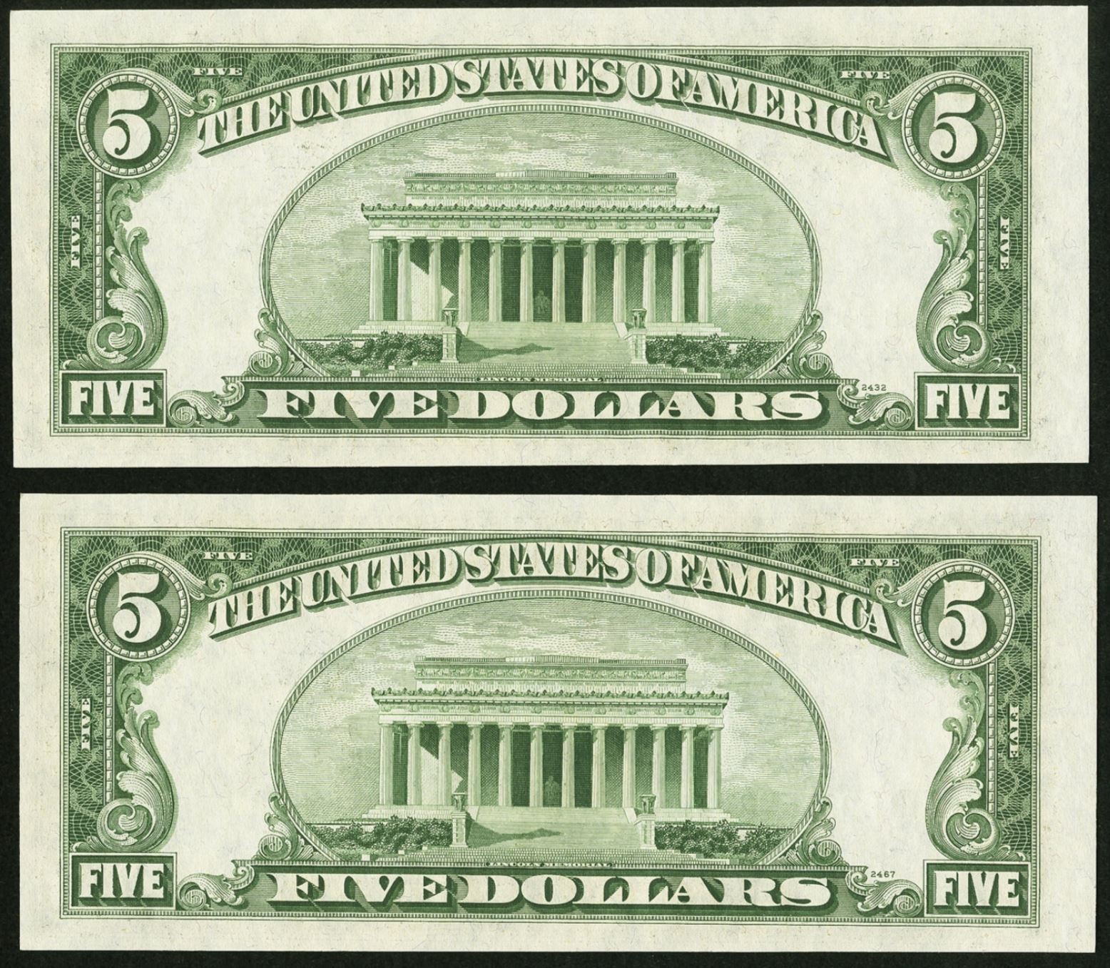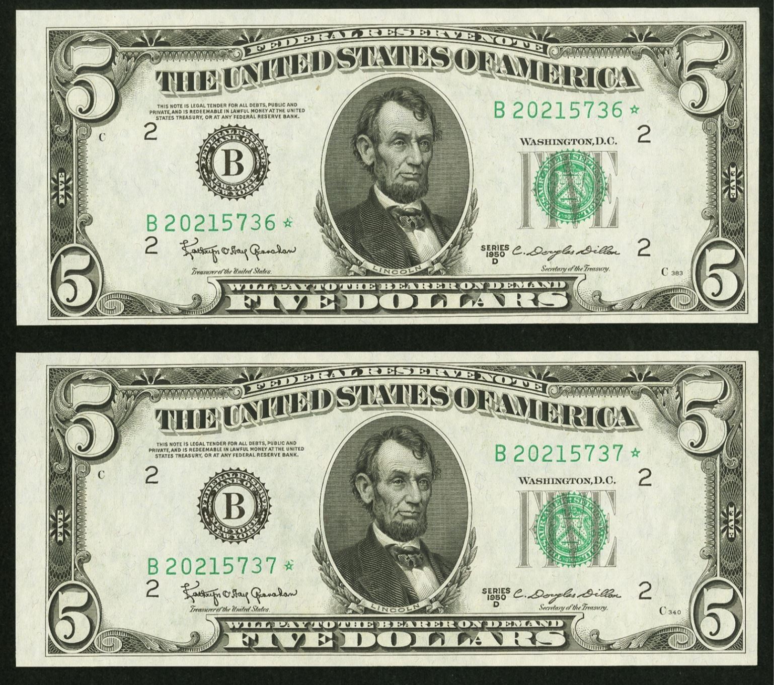 One 1950D $5 Consecutive STAR New York FRN's.