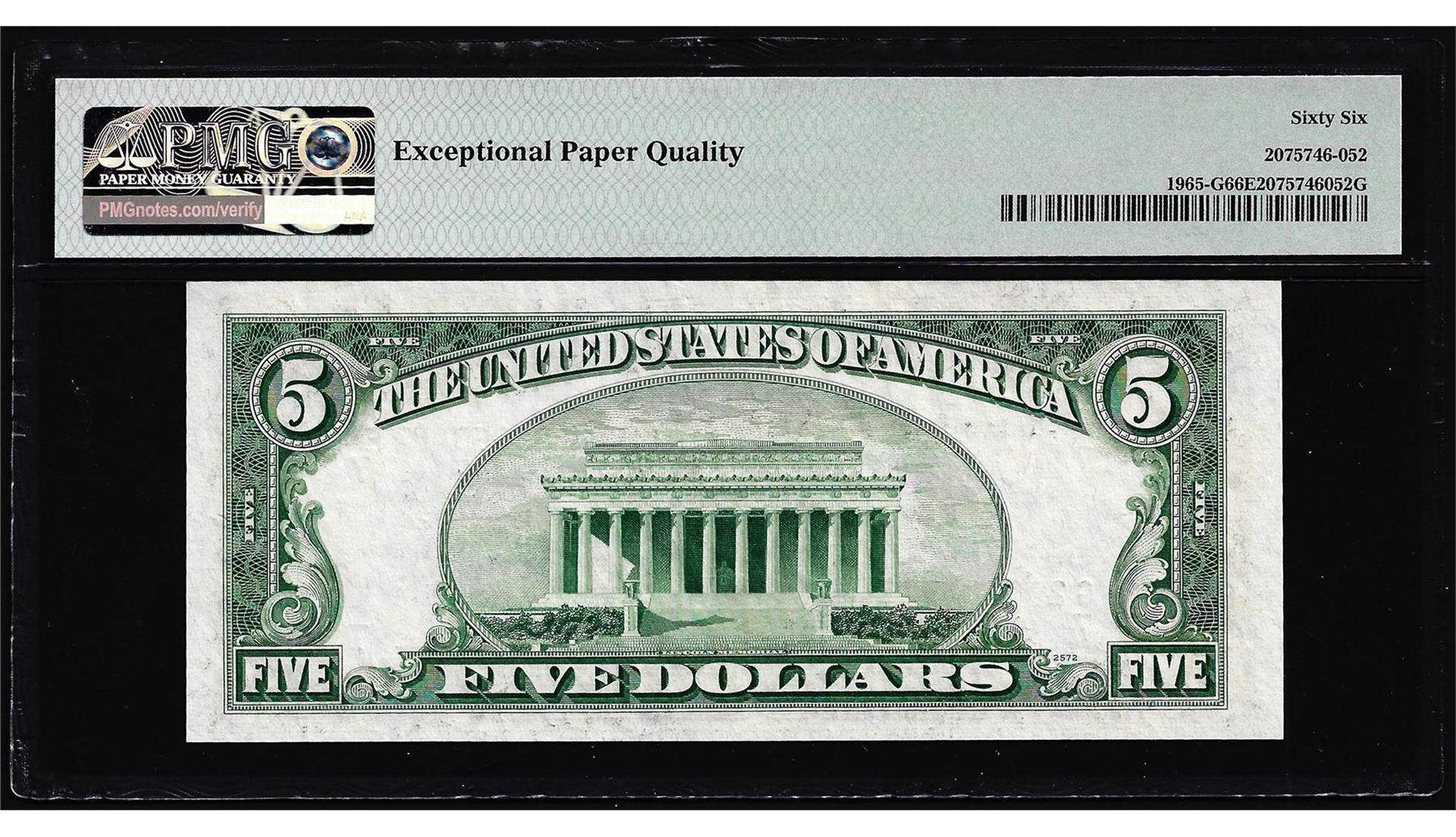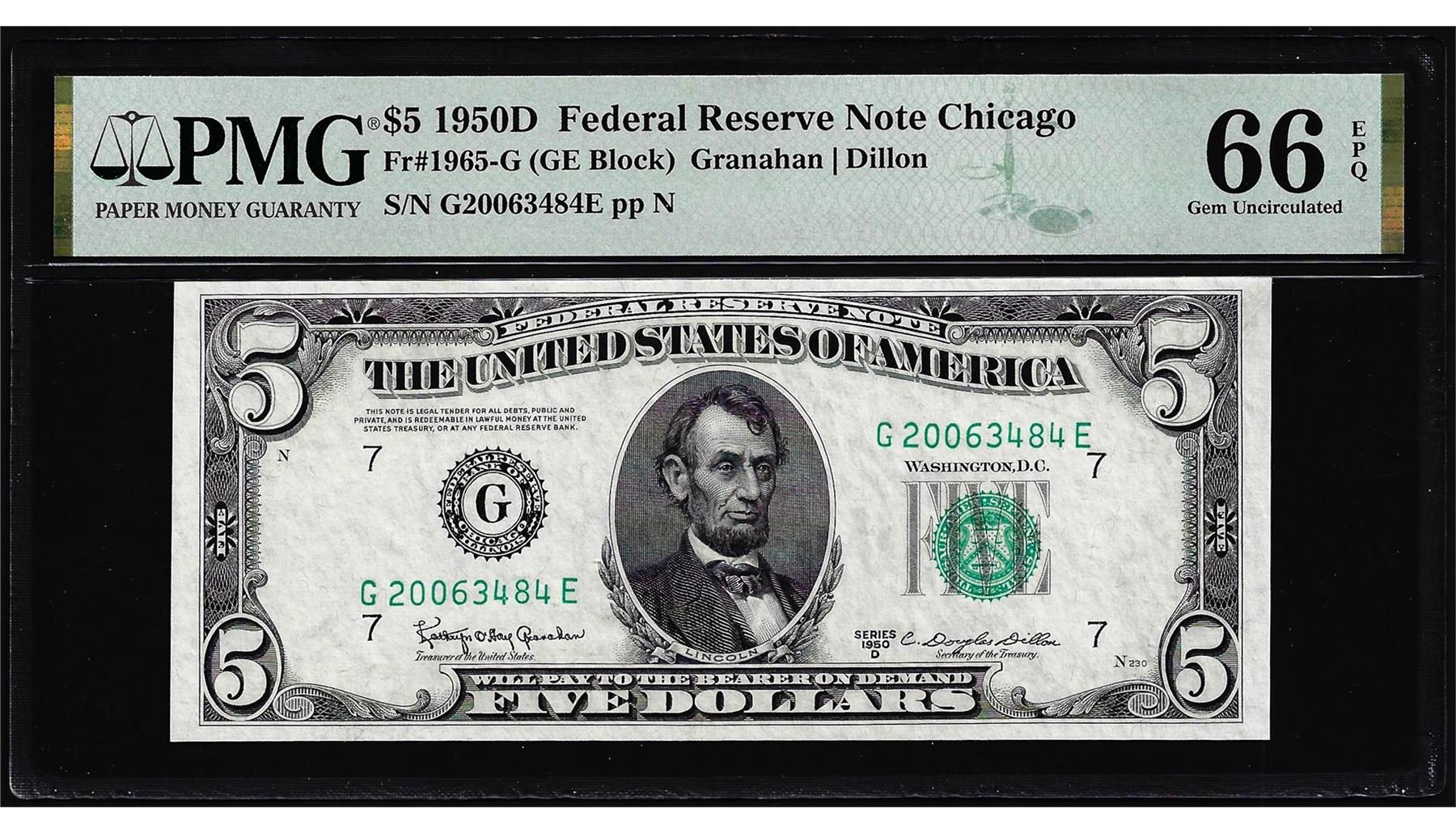 One 1950D $5 Federal Reserve Note Chicago Fr.1965-G PMG Gem Uncirculated 66EPQ. PMG Certified.