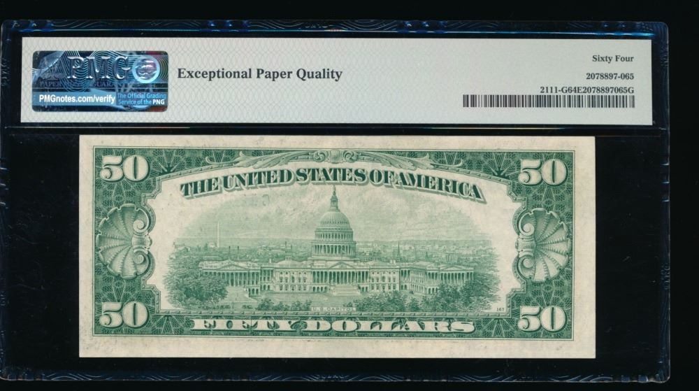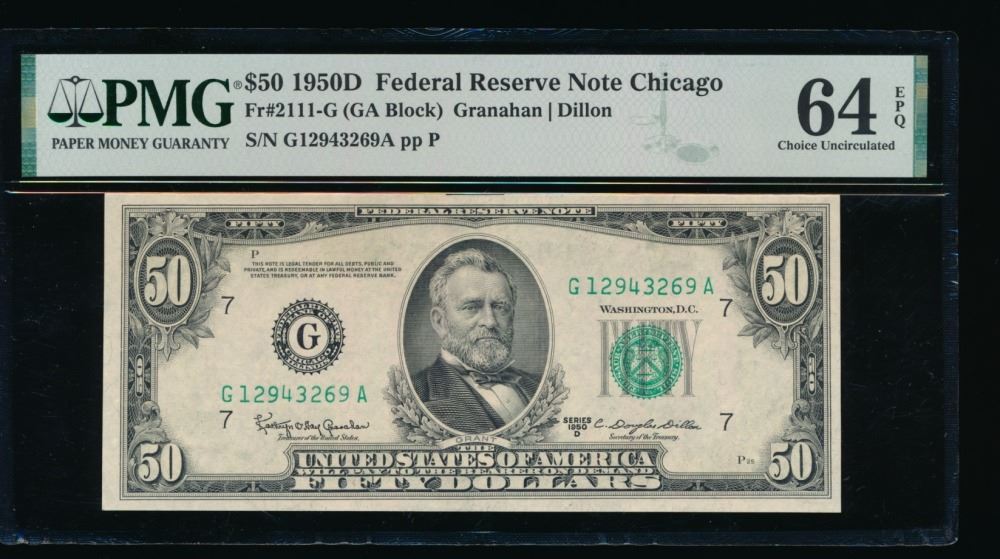 One 1950D $50 Chicago FRN PMG 64EPQ.