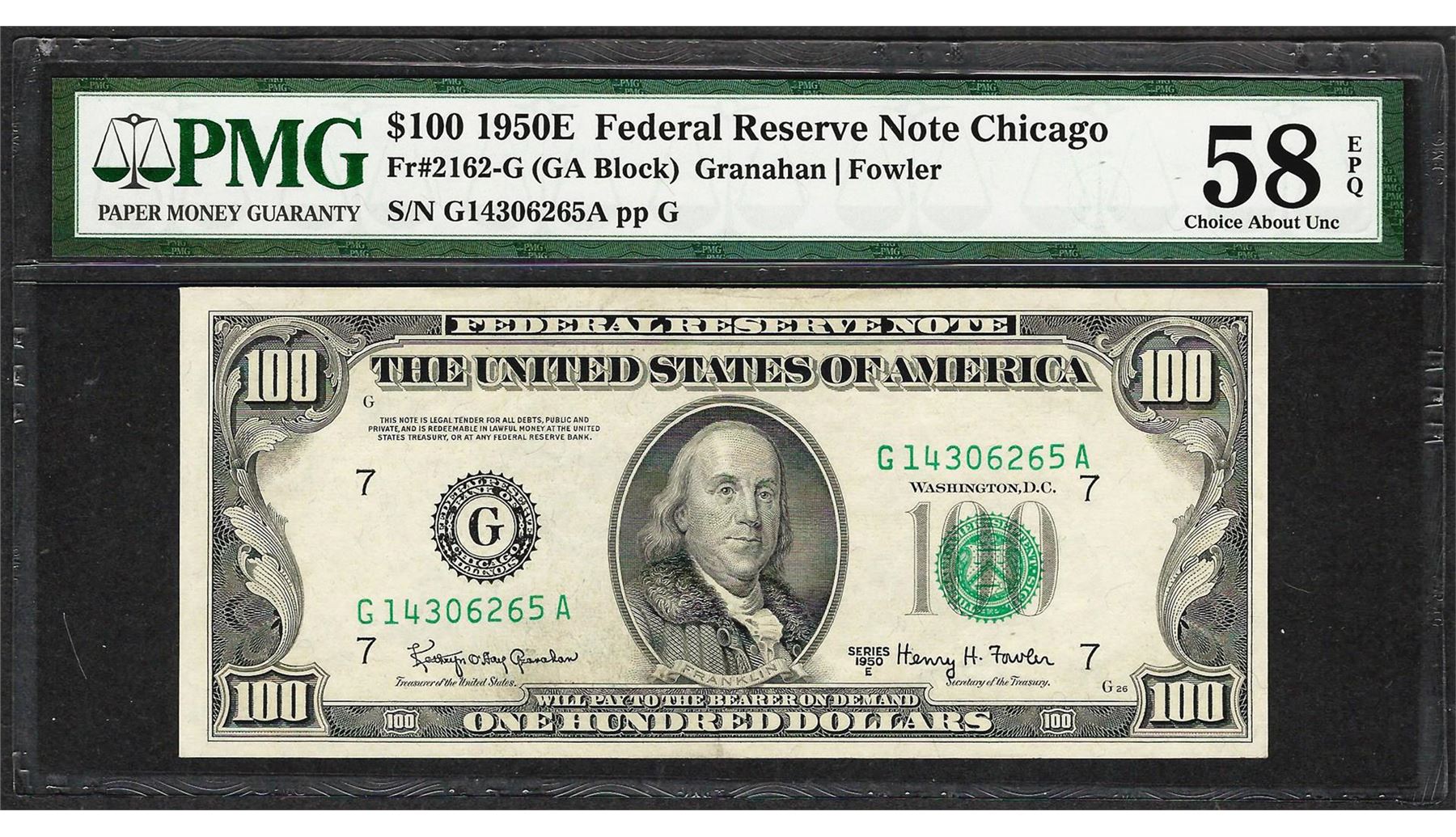 One 1950E $100 Federal Reserve Note Chicago Fr.2162-G PMG About Uncirculated 58EPQ. PMG Certified.