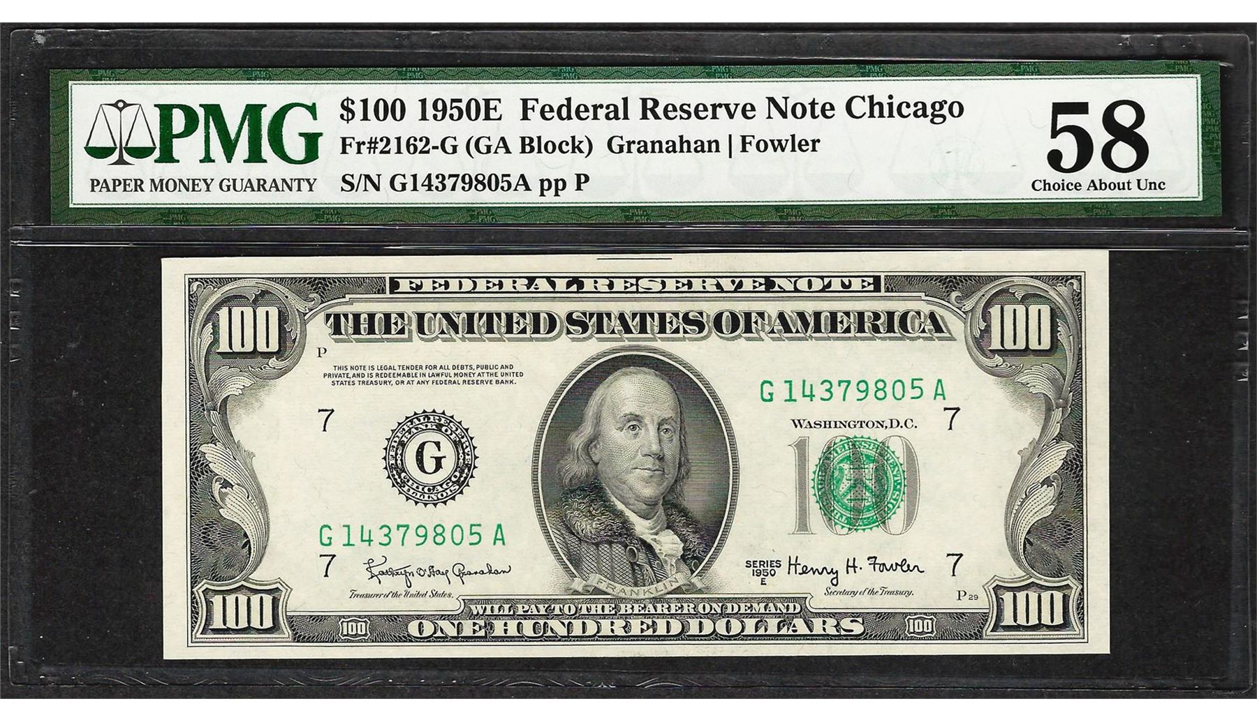 One 1950E $100 Federal Reserve Note Chicago Fr.2162-G PMG About Uncirculated 58. PMG Certified.
