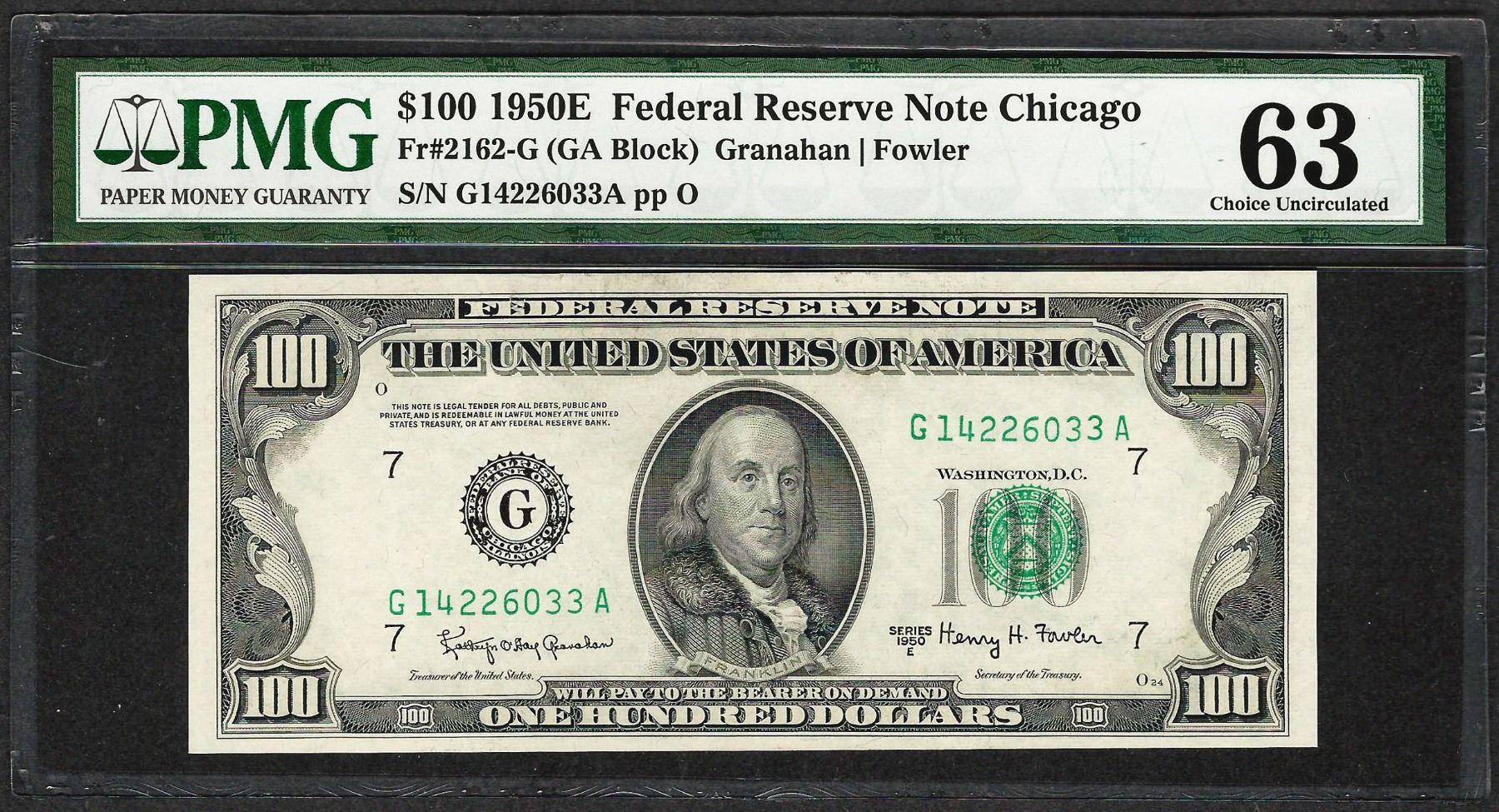 One 1950E $100 Federal Reserve Note Chicago Fr.2162-G PMG Choice Uncirculated 63.