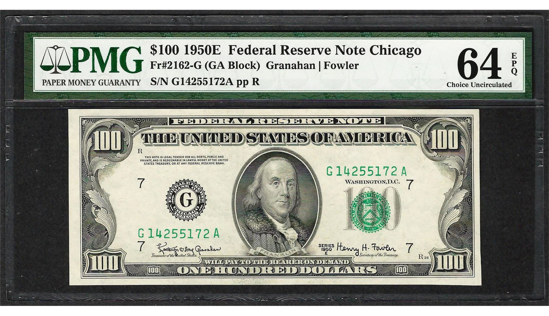 One 1950E $100 Federal Reserve Note Chicago Fr.2162-G PMG Choice Uncirculated 64EPQ. PMG Certified.
