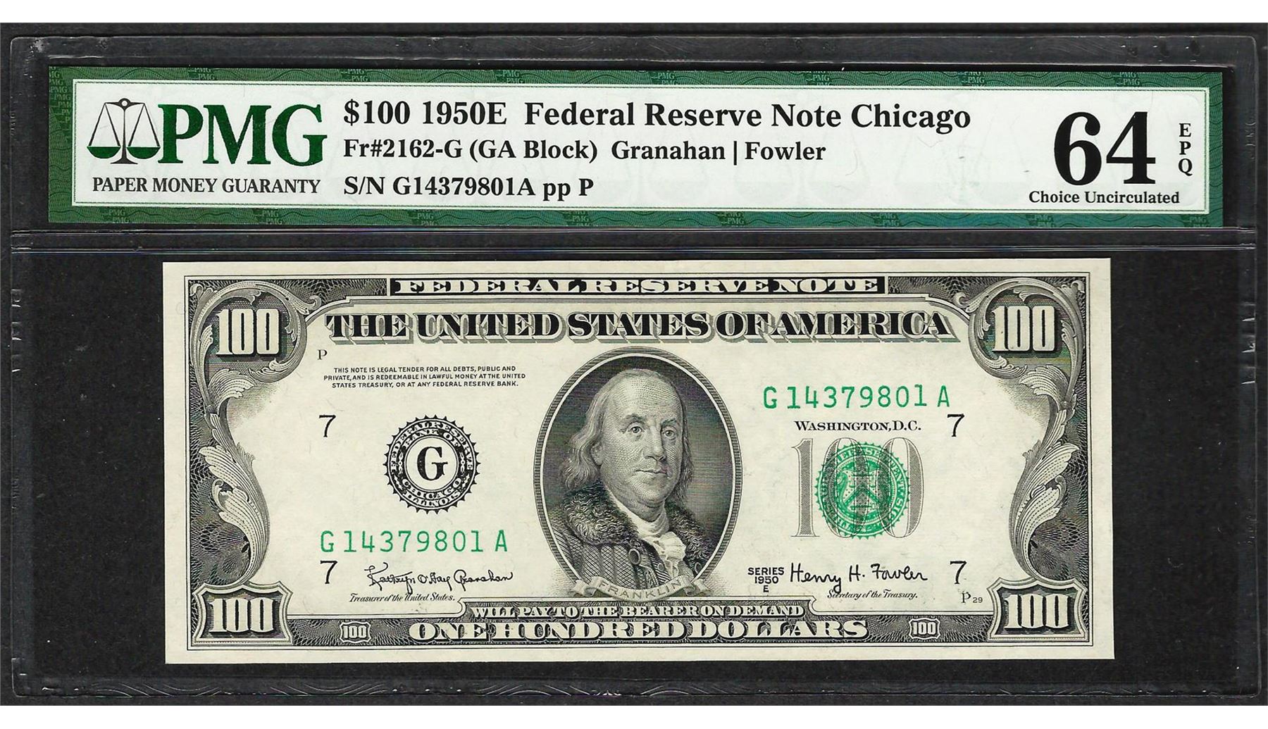 One 1950E $100 Federal Reserve Note Chicago Fr.2162-G PMG Choice Uncirculated 64EPQ. PMG Certified.
