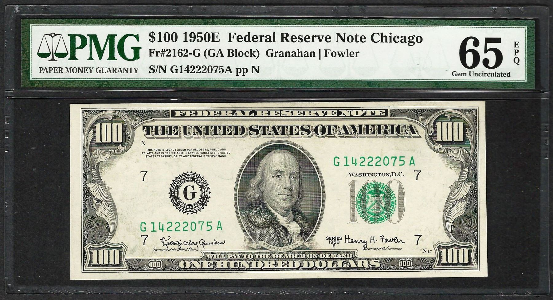 One 1950E $100 Federal Reserve Note Chicago Fr.2162-G PMG Gem Uncirculated 65EPQ.