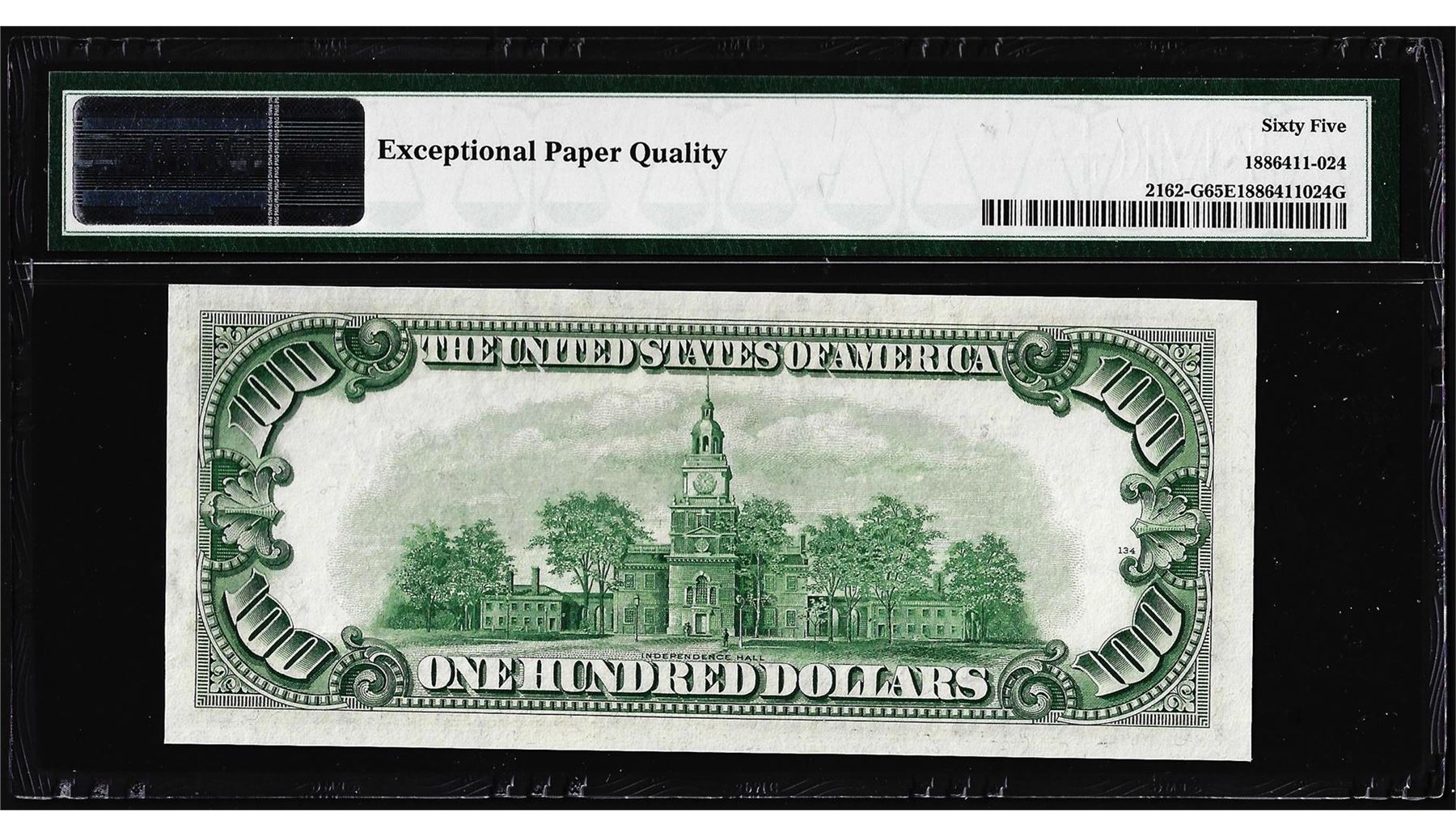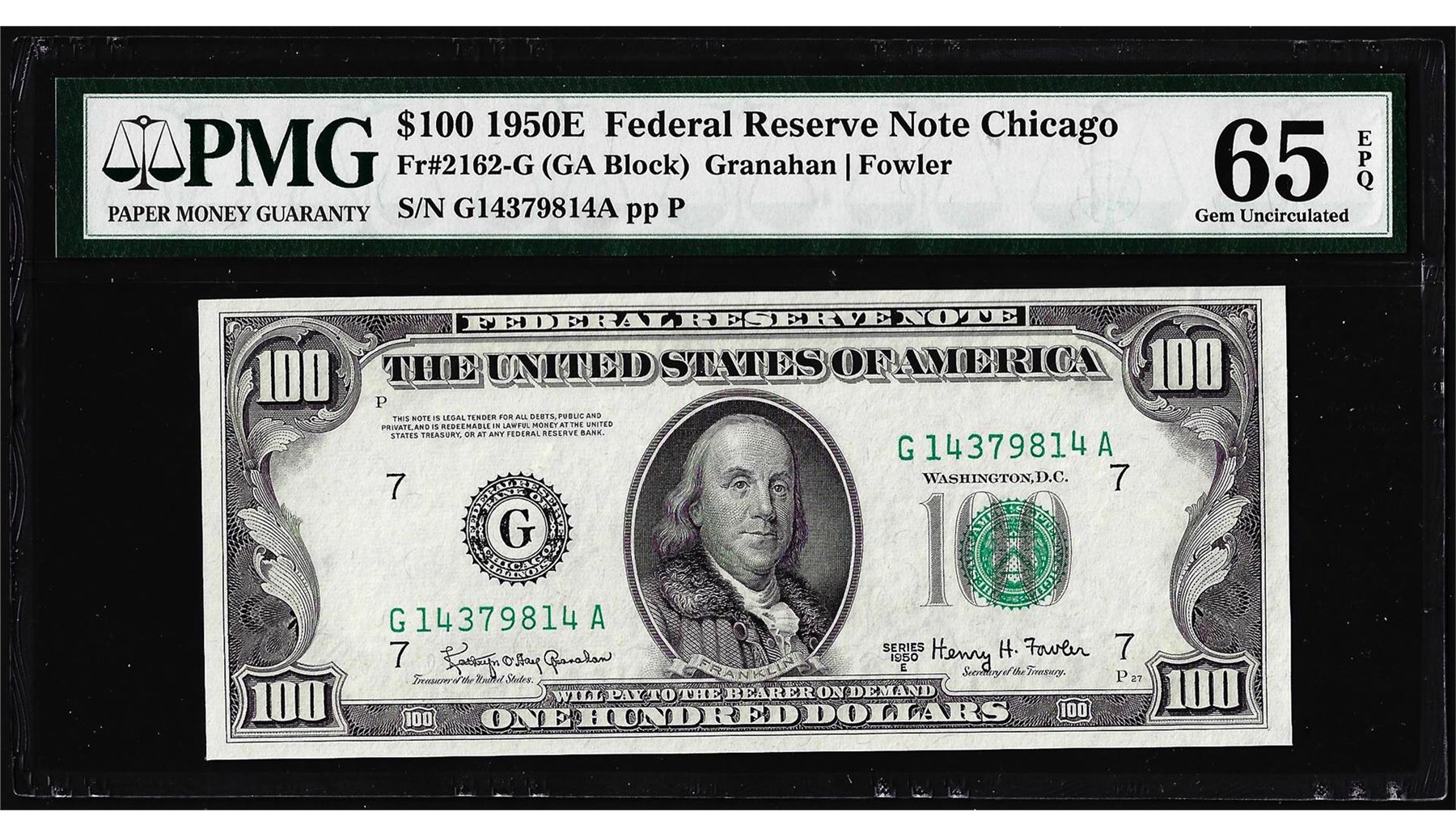 One 1950E $100 Federal Reserve Note Chicago Fr.2162-G PMG Gem Uncirculated 65EPQ. PMG Certified.