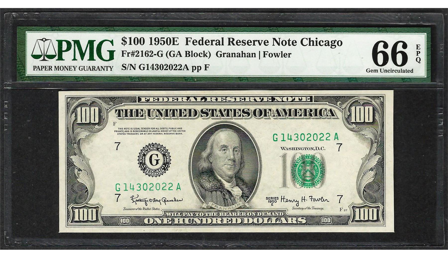 One 1950E $100 Federal Reserve Note Chicago Fr.2162-G PMG Gem Uncirculated 66EPQ. PMG Certified.