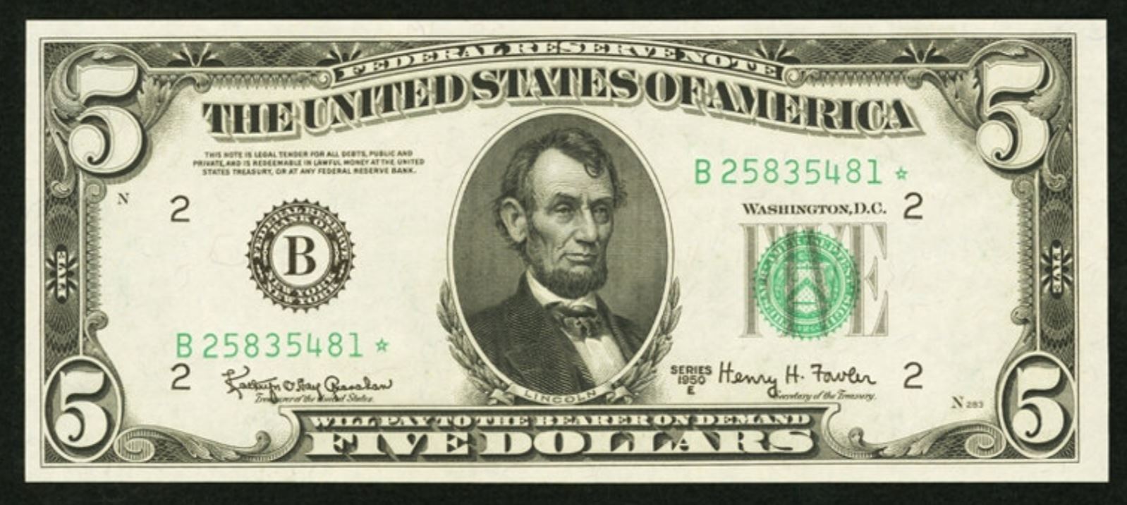 One 1950E $5 Federal Reserve STAR Note Fr. 1966-B*.