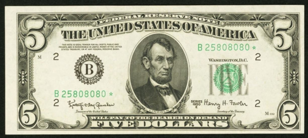 One 1950E $5 Federal Reserve STAR Note Fr. 1966-B*.