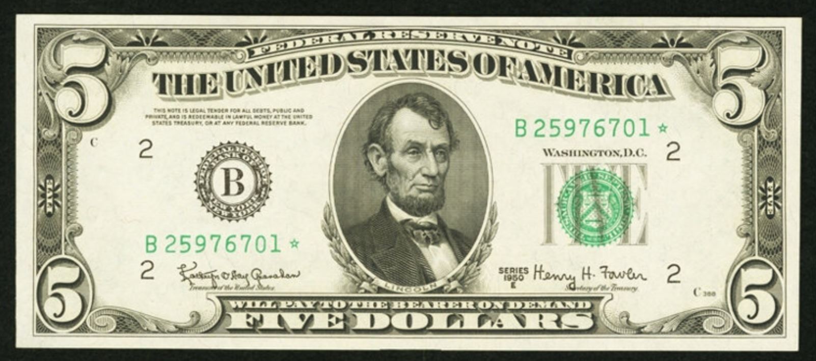 One 1950E $5 Federal Reserve STAR Note Fr. 1966-B*.
