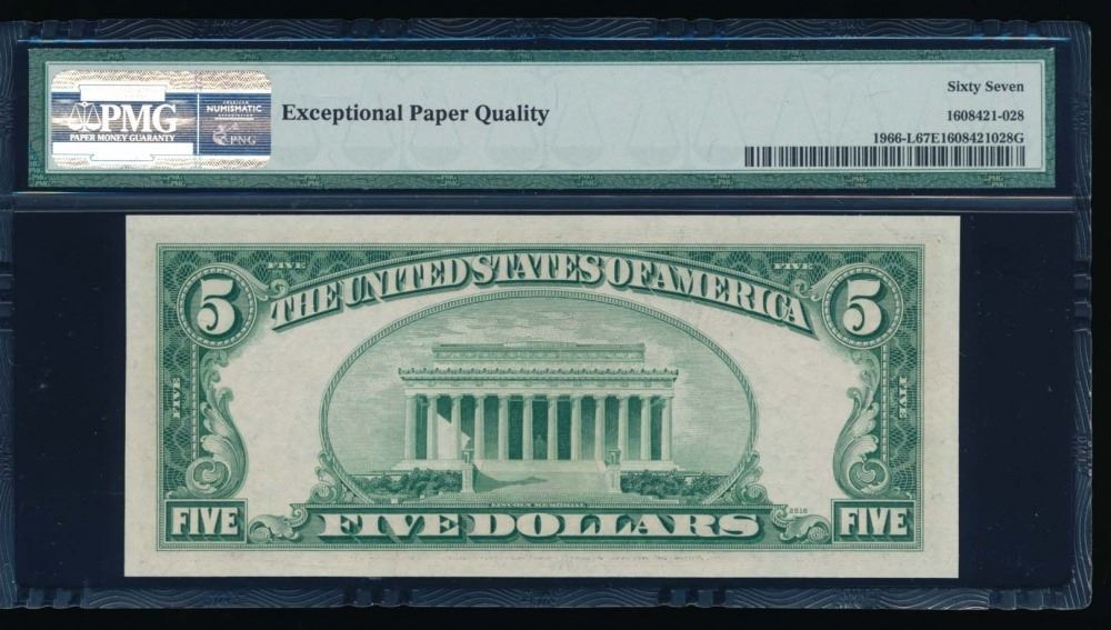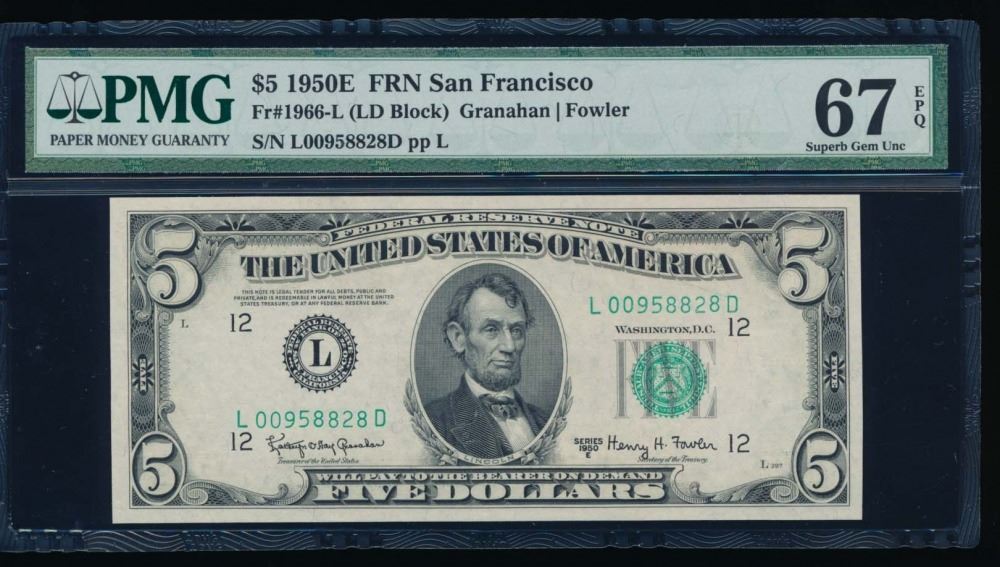 One 1950E $5 San Francisco Federal Reserve Note PGM 67EPQ.