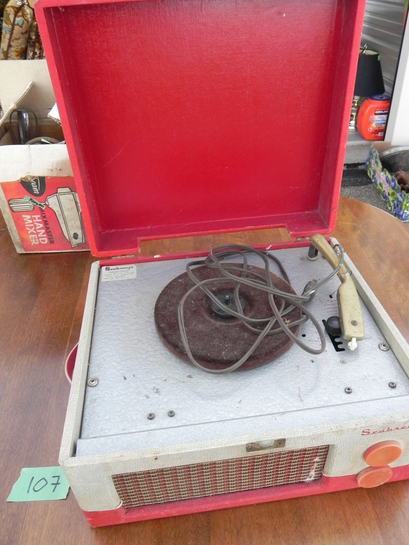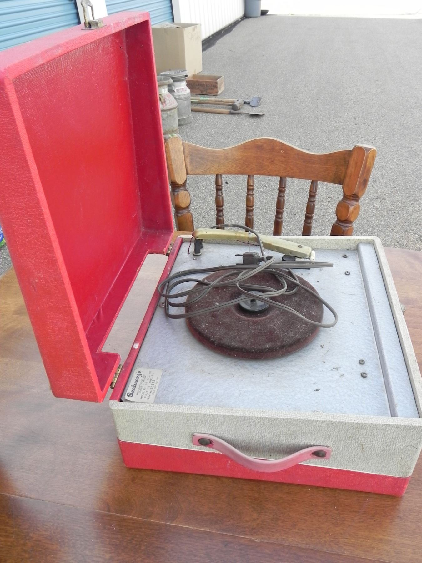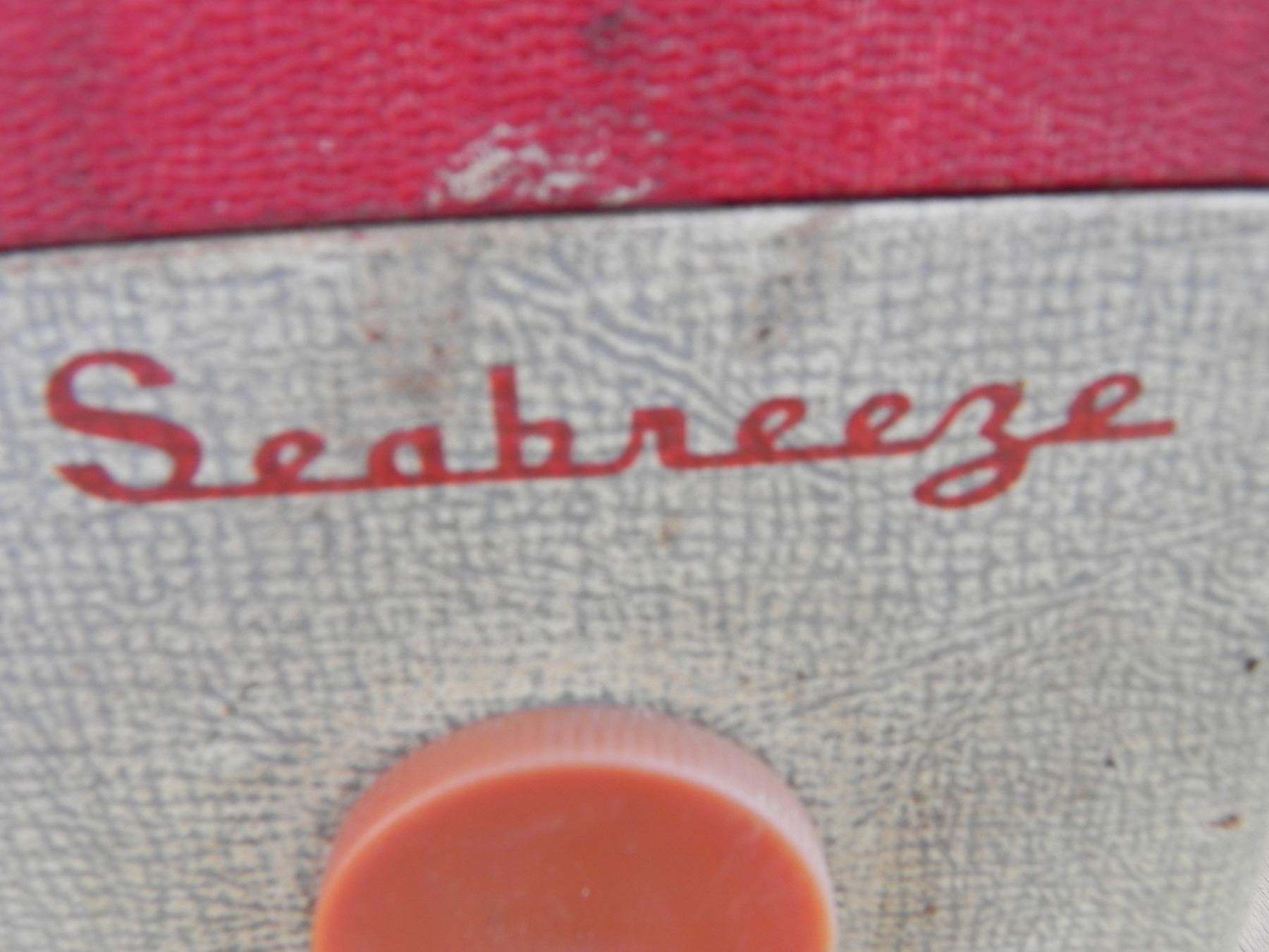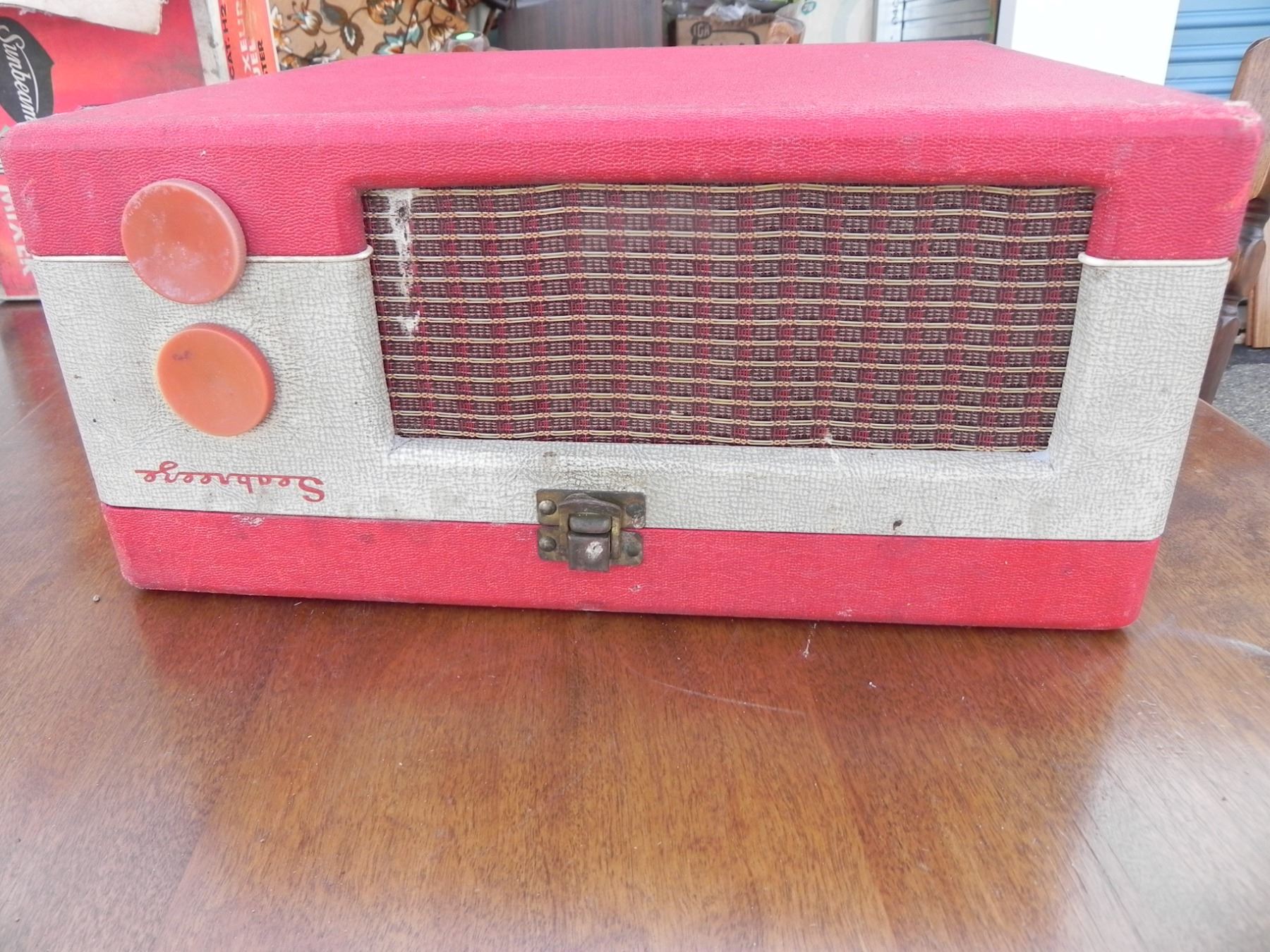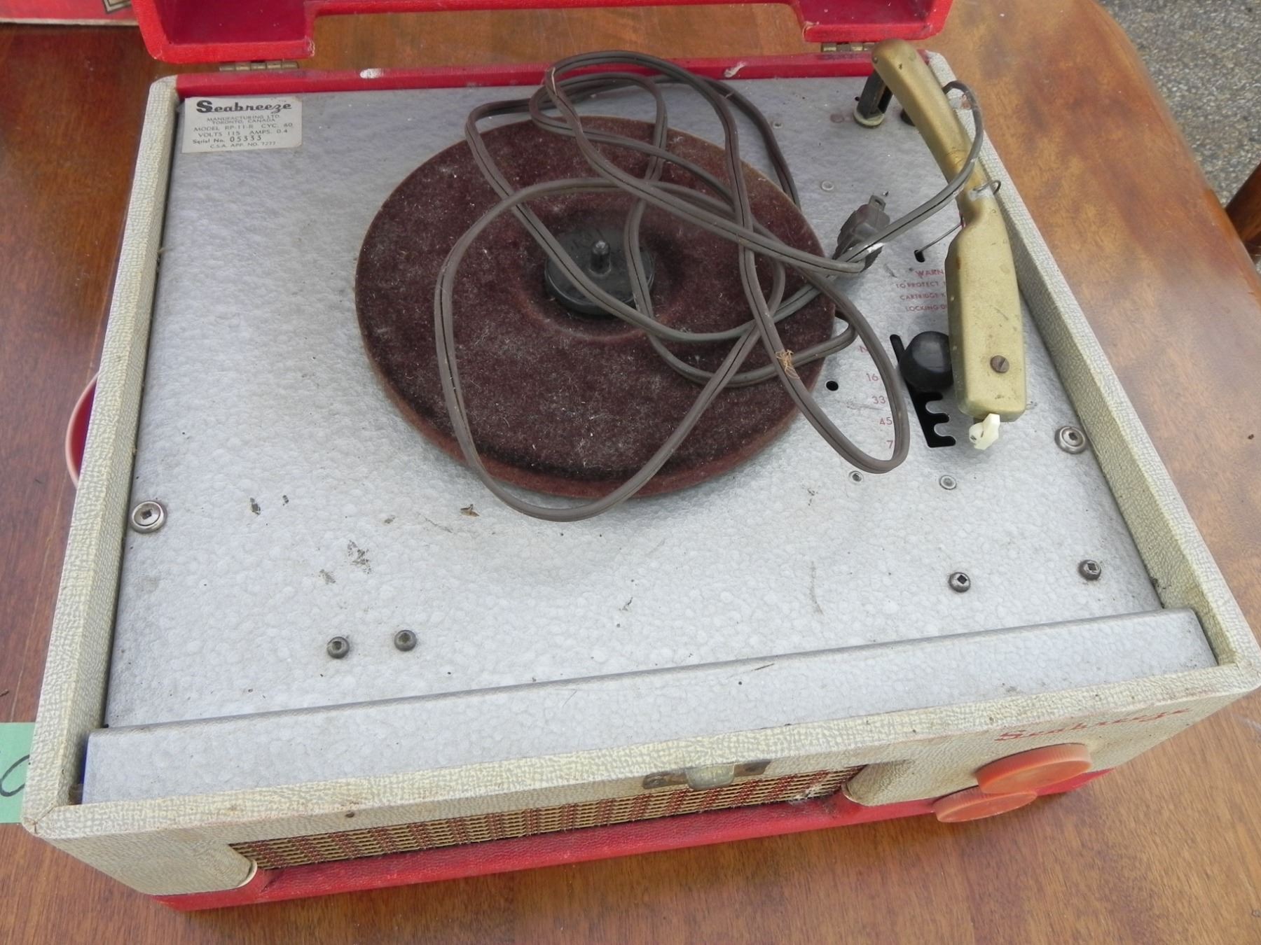 1950S SEABREEZE 2 TONE RECORD PLAYER. RED AND WHITE. UNTESTED