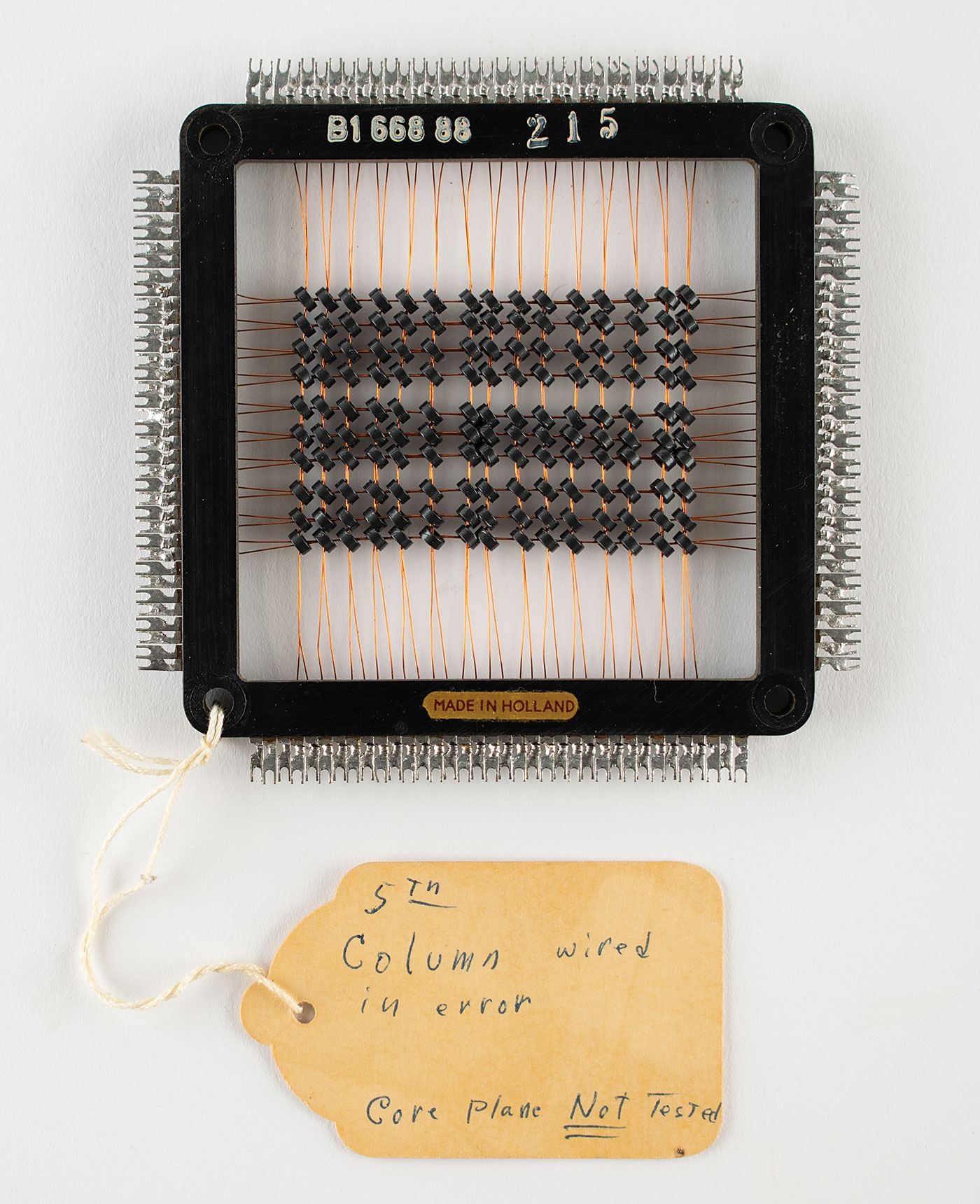 Rare and historic circa 1950s 4-wire core memory plane, featuring a 10 by 15 array with 150 separate ferrite cores hand-wired into the plane. The overall dimensions are 4 1/16˝ x 4 1/16˝ x 1/4˝, and the edge is marked "B16688 88 215" and "Made in Holland." This is an example of core memory using four wires—X, Y, Sense, and Inhibit—as used in very early systems which were primarily dedicated to military and scientific applications; soon after, the separate Sense and Inhibit wires were combined into a single Sense/Inhibit line, making this early four-wire version very rare. The low density of this plane adds to its desirability. It survived the demilitarization destruction process because it was wired in error and never made it into a piece of equipment. There are no machine marks on the mounting holes and the pre-tinned soldier leads were never used, indicating that it was never installed and remains in pristine condition. It was tagged by an engineer “5th Column wired in error” and “Core Plane Not Tested,” meaning that current was never run through it because it failed a visual inspection. Displayed in a Riker box.