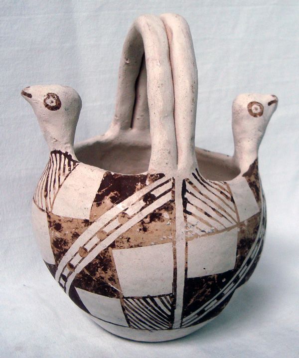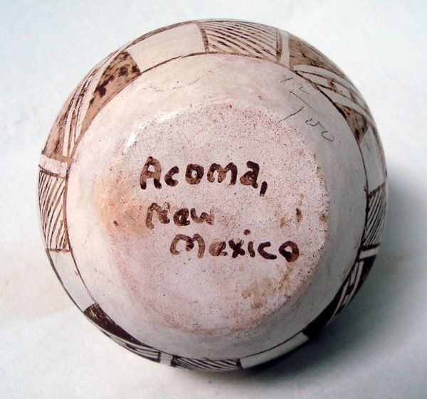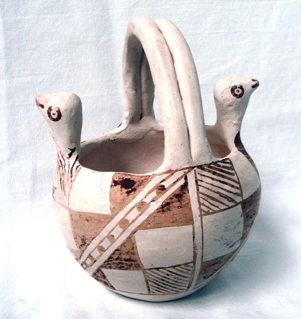 From the Nick and Suzanne Nicholas Collection we have a 1950s Acoma Double Bird Basket Pottery, measures 4'' x 4.5'', features geometric and line designs, and opposing bird heads on rim, signed on bottom Acoma, New Mexico